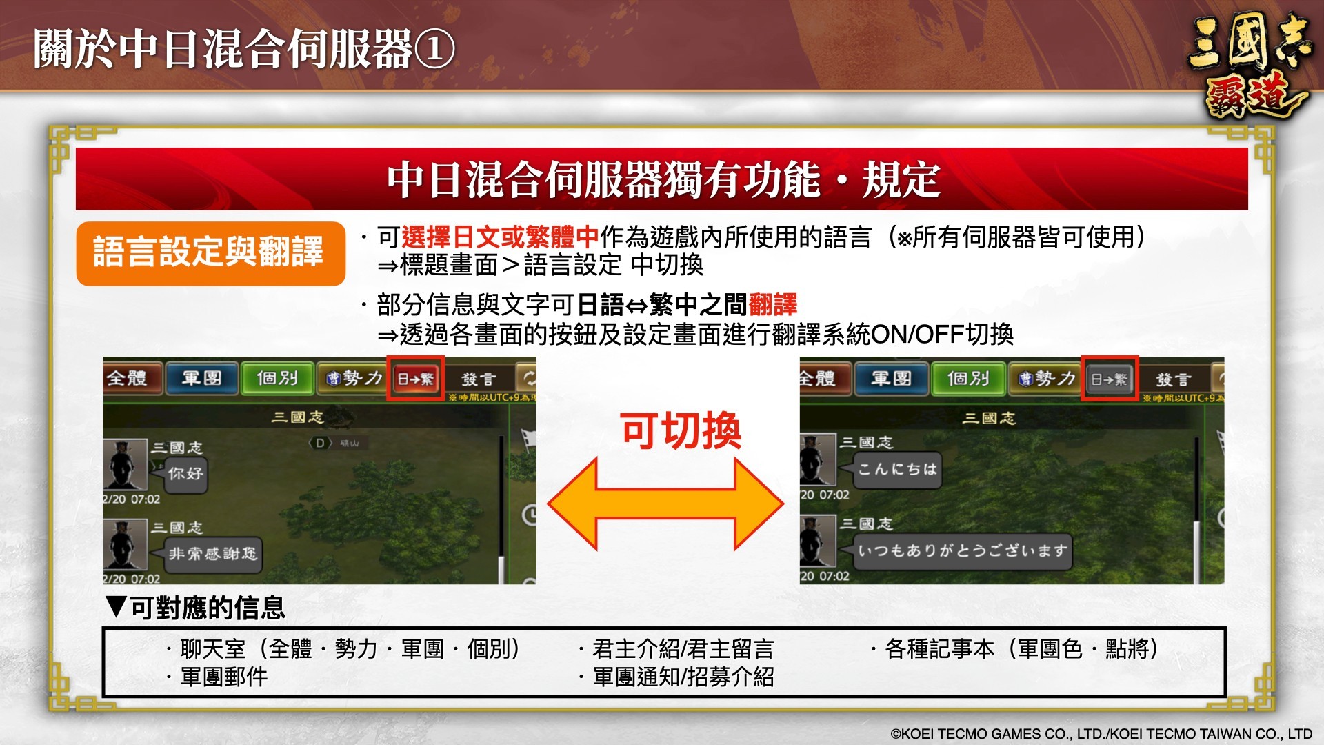 此外,如 11 月告知可自日文版、繁體中文版兩個伺服器轉移的「中日混合伺服器」開始營運。中日混合伺服器的聊天及軍團信件等將設置翻譯功能,可以更方便地互相交流。也實施了實裝 LR 交流和修改黃巾活動等更新。