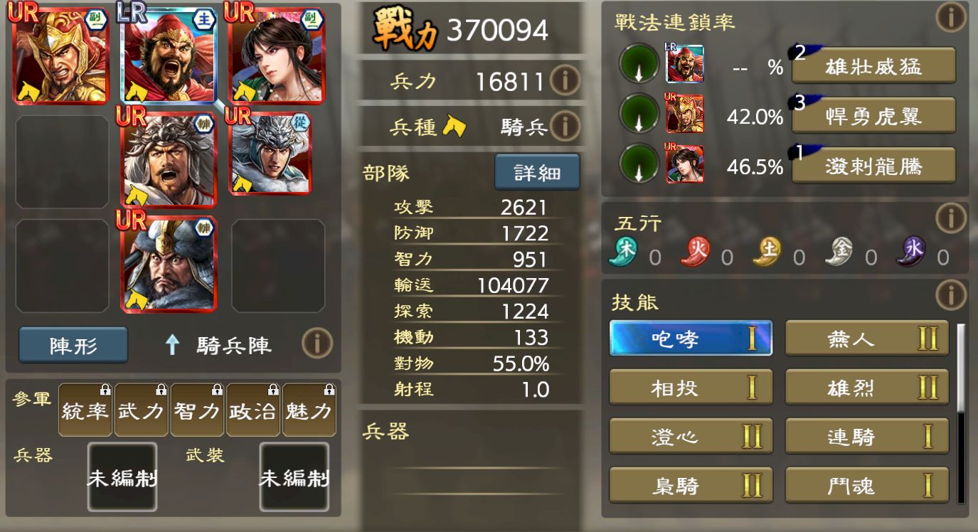 ⚫ 侍從配置馬超可發動「雄烈(通常攻擊目標部隊數+1)」與「相投(副將連鎖機率 +1)」,同時透過馬騰的「連騎」提升騎兵連鎖機率 +2%