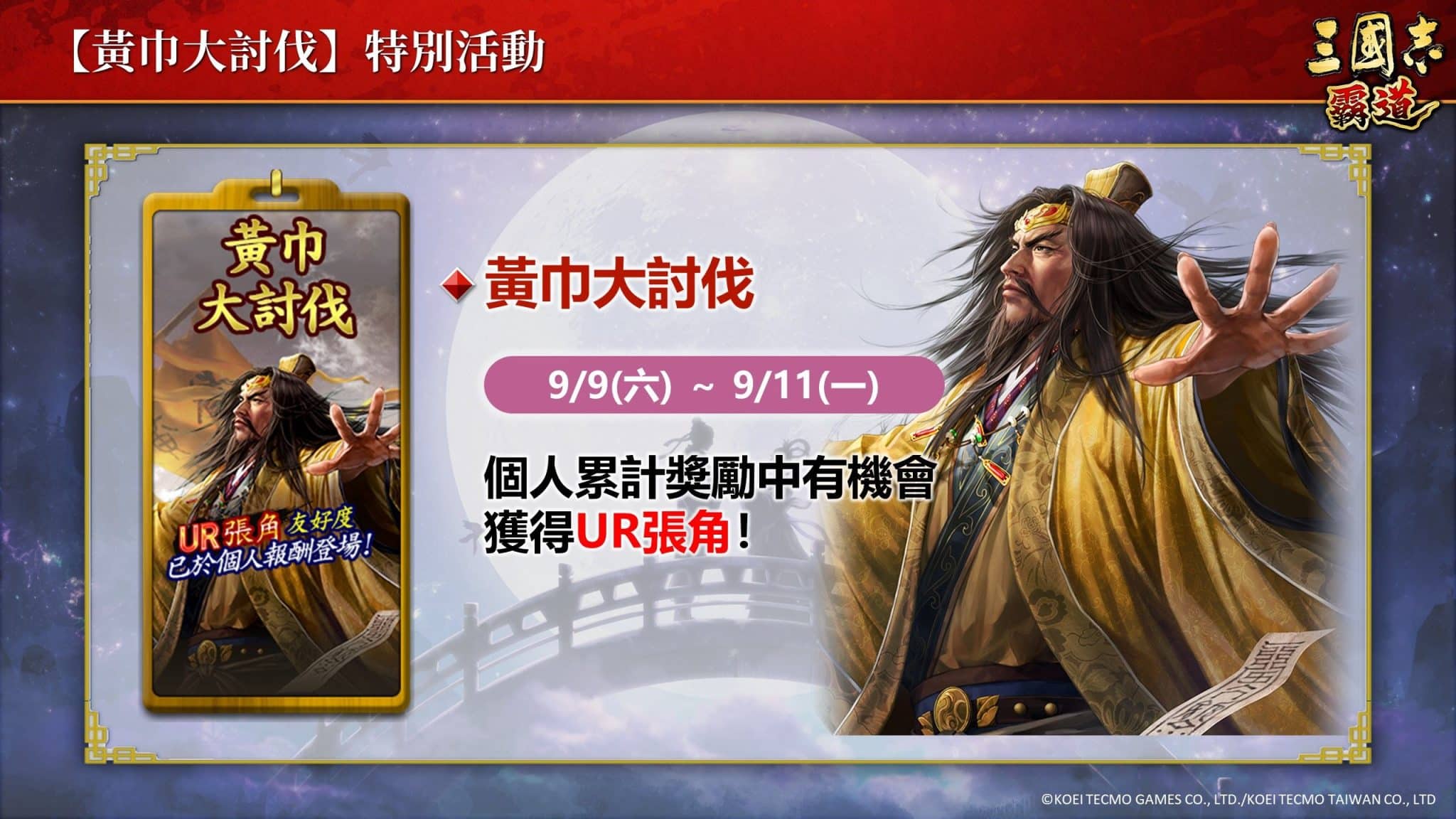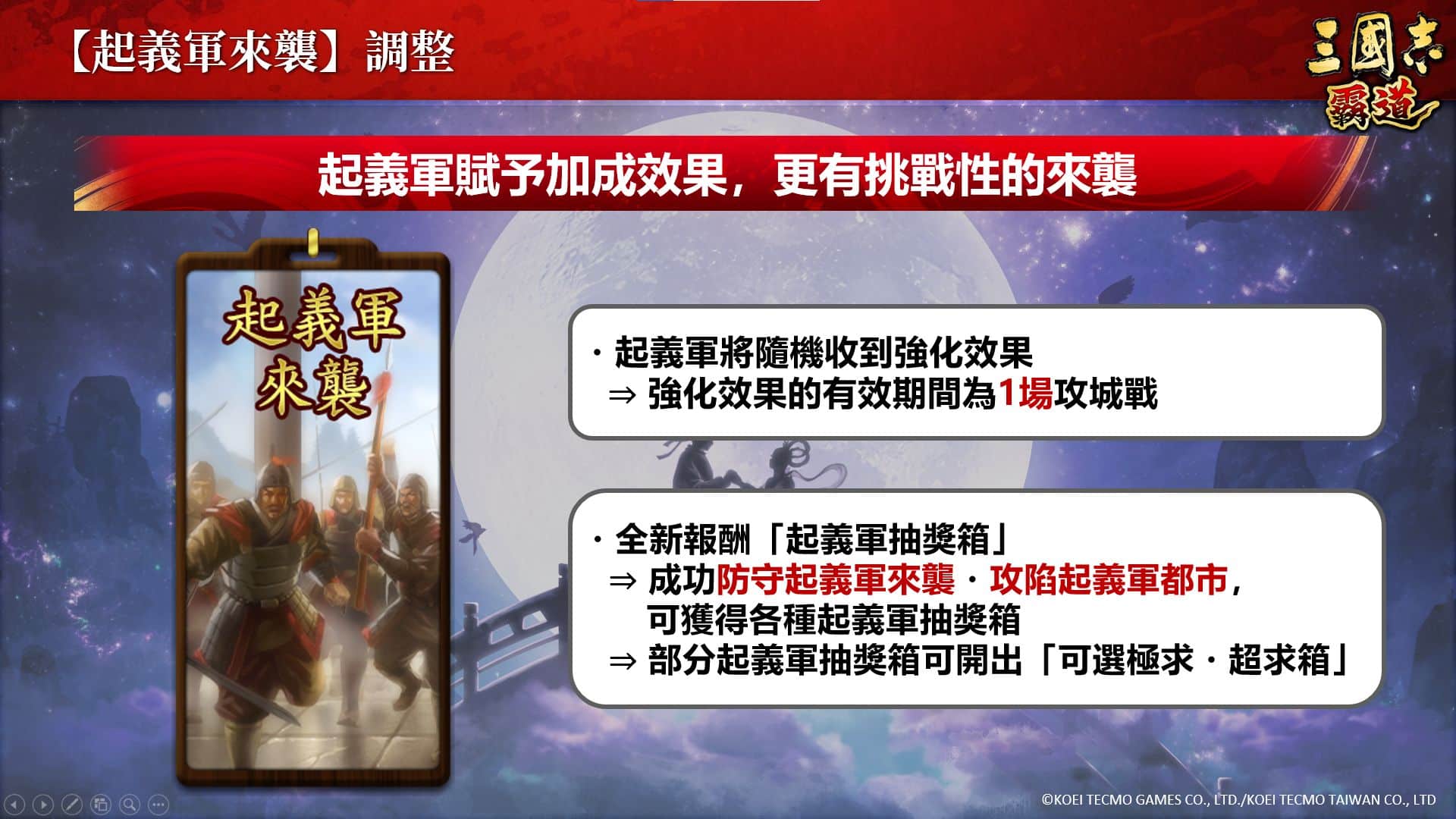 「起義軍來襲」也將進行改修,起義軍將被賦予特別效果,玩家需要臨機應變,擊退起義軍。成功防守可獲得起義軍抽選箱。「黃巾大討伐」的報酬中還會加入天賦 1200 的 UR 張角。
