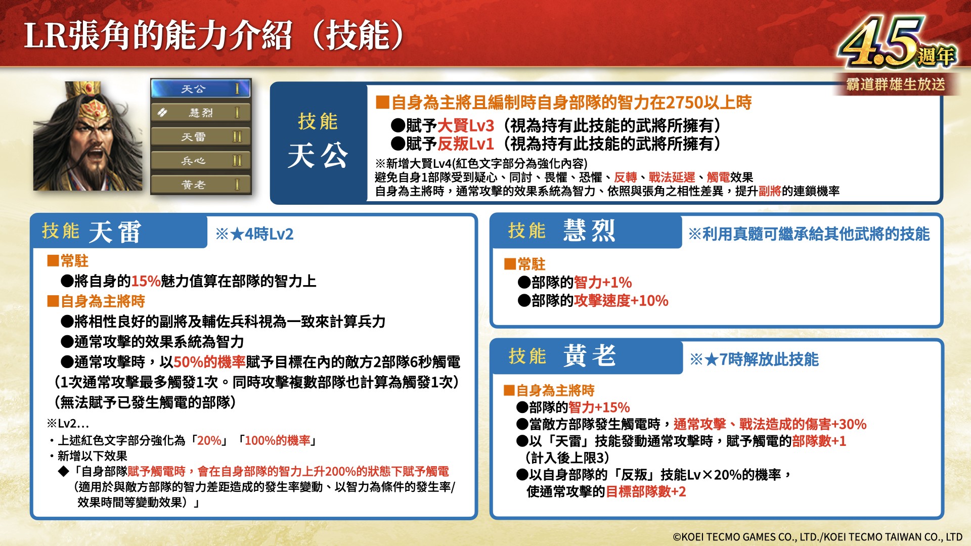 「UR 張梁」擁有隨著技能「反叛」的 Lv 強化的戰法、技能,是可以強化張角通常攻擊騎兵武將。「UR 張寶」和張梁同樣擁有隨著技能「反叛」的 Lv 強化的戰法、技能,是可以強化張角賦予弱化的弓兵武將。