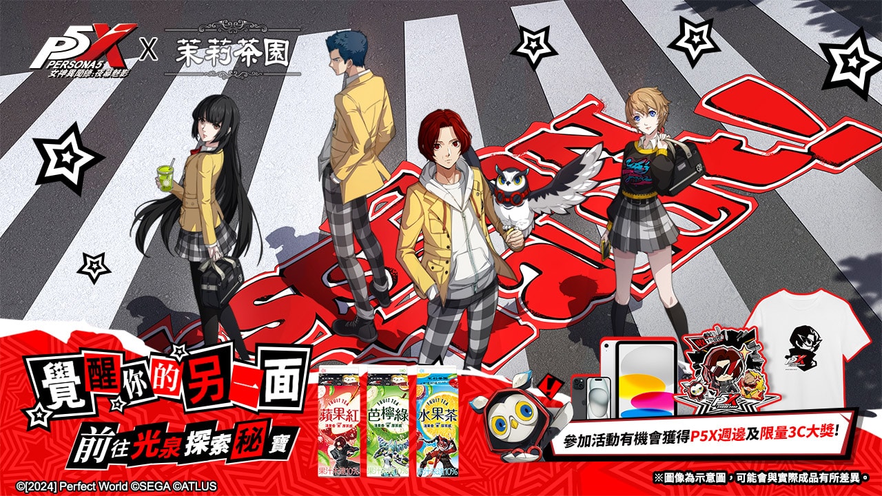 為歡慶 P5X 上市,P5X 將攜手光泉果茶物語茉莉茶園展開合作,從 2024 年 4 月 24 日至 5 月 21 日,玩家到全台超商及實體量販門市購買光泉新鮮屋指定飲品,蘋果紅茶、芭樂香檸綠茶、熱帶水果紅茶,透過瓶身上的限量虛寶貼紙,即有機會獲得抽卡券及大量養成材料等虛寶獎勵。此外,玩家還能參與第二重抽獎活動,有機會獲得 iPhone 15、iPad Air 及 P5X 周邊。
