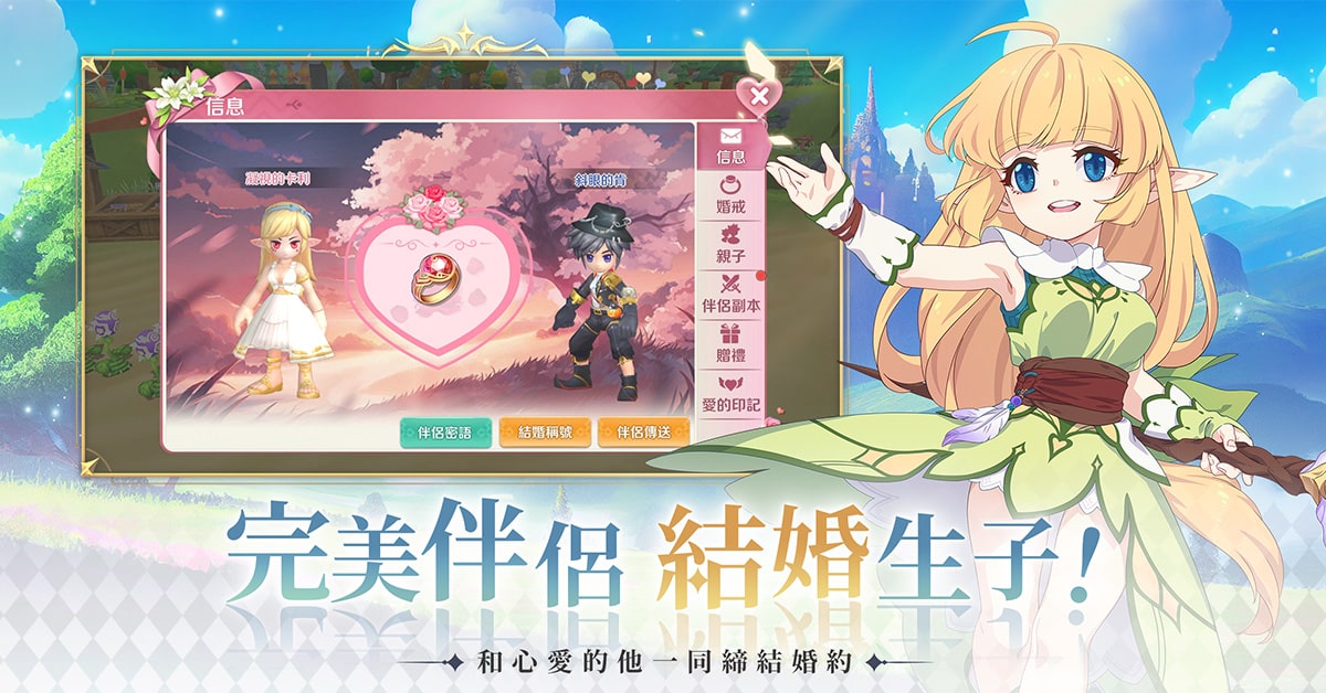 《LUNA》經典的自由結婚系統在手遊《LUNA:永恆月之國》中也完美復刻,任何性別組合都可以在遊戲中結為伴侶,除了可以攜手挑戰伴侶專屬副本、在約會地下城挑戰情侶互動,還能解鎖親子系統,共同培養愛的結晶。