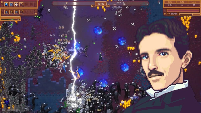 本作是採取《吸血鬼倖存者》的遊戲方式,差別在玩家操作的是林肯、特斯拉、尼祿等歷史上的偉人來面對大量的敵人。遊戲將提供 150 種以上的武器跟道具,面對從石器時代到中世歐洲等各種時代來的敵人,估計 1 局進行 20 分鐘。
