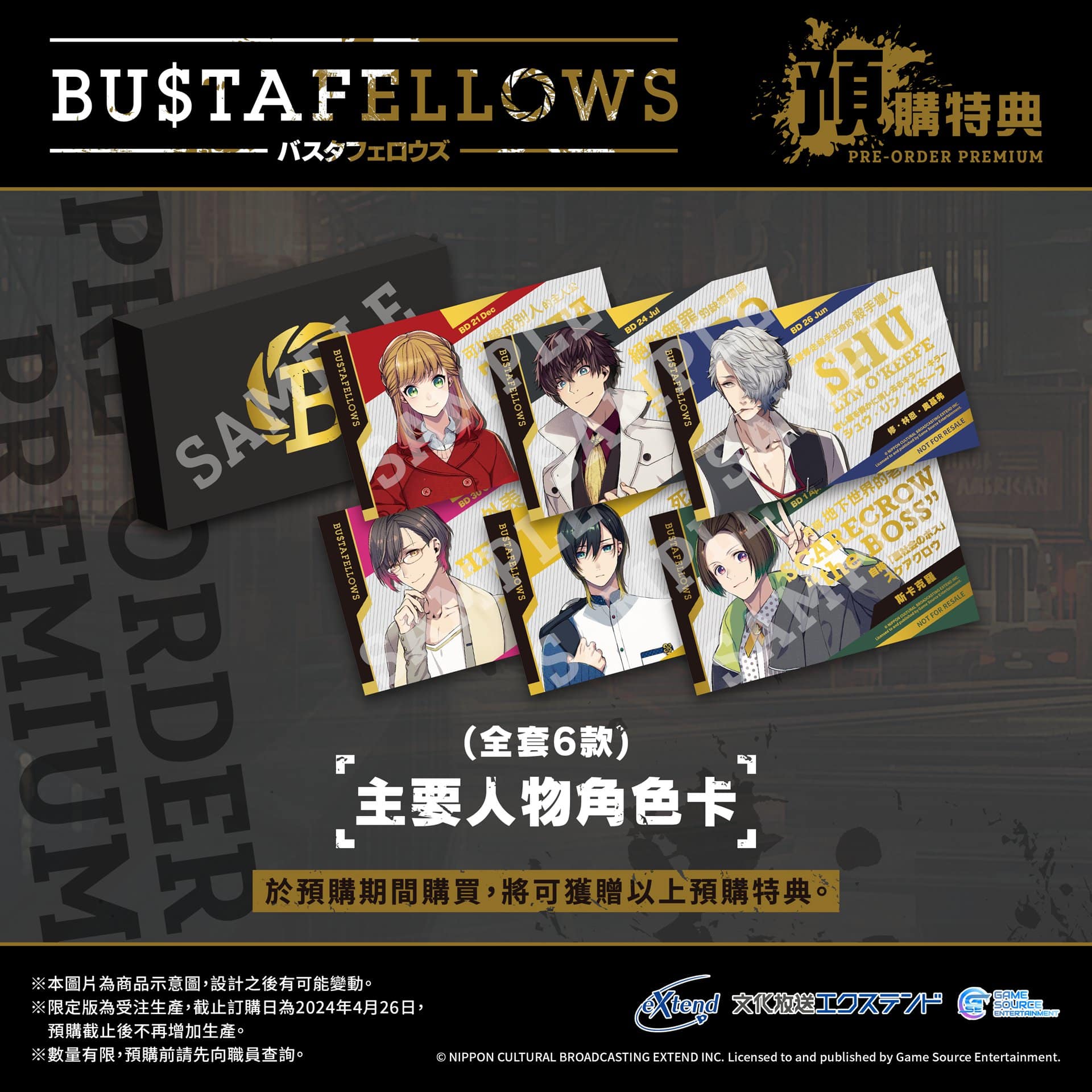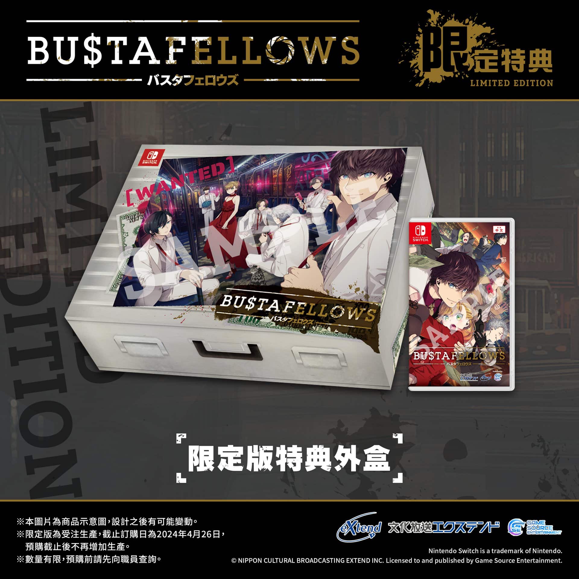 GSE 宣佈,與日本的媒體內容製作公司「NIPPON CULTURAL BROADCASTING EXTEND」首度合作,為各位中文玩家帶來以犯罪懸疑為主題的女性向遊戲《BUSTAFELLOWS》Nintendo Switch 的繁體中文版預定 2024 年 6 月 24 日發售,即日起到 4 月 26 日開放預購。