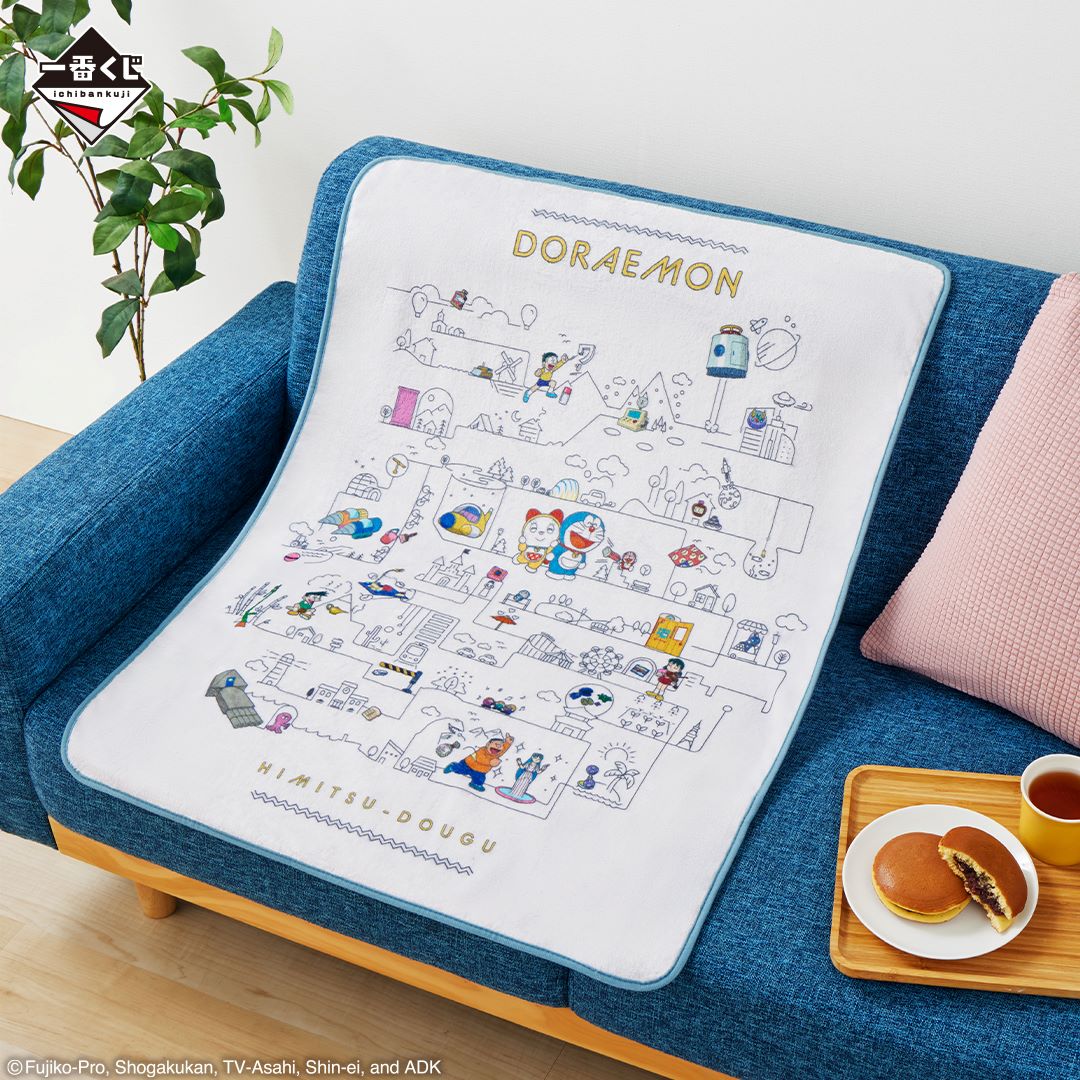 A 獎祭出哆啦 A 夢乘坐經典道具時光機的角色模型;B 獎推出 90 公分的插畫大毛毯,毛毯上隱藏了時光布、助興樂團、樵夫的泉水等知名經典道具圖案;C 獎則帶來兩款實用的辦公室小物,中獎者可自由選款,第一款是以「會飛的聲音結塊」道具為靈感設計的小物,可用來收納橡皮筋、髮圈等日常小物;另一款則是以熱門道具「美食桌巾」設計的趣味造型杯蓋。