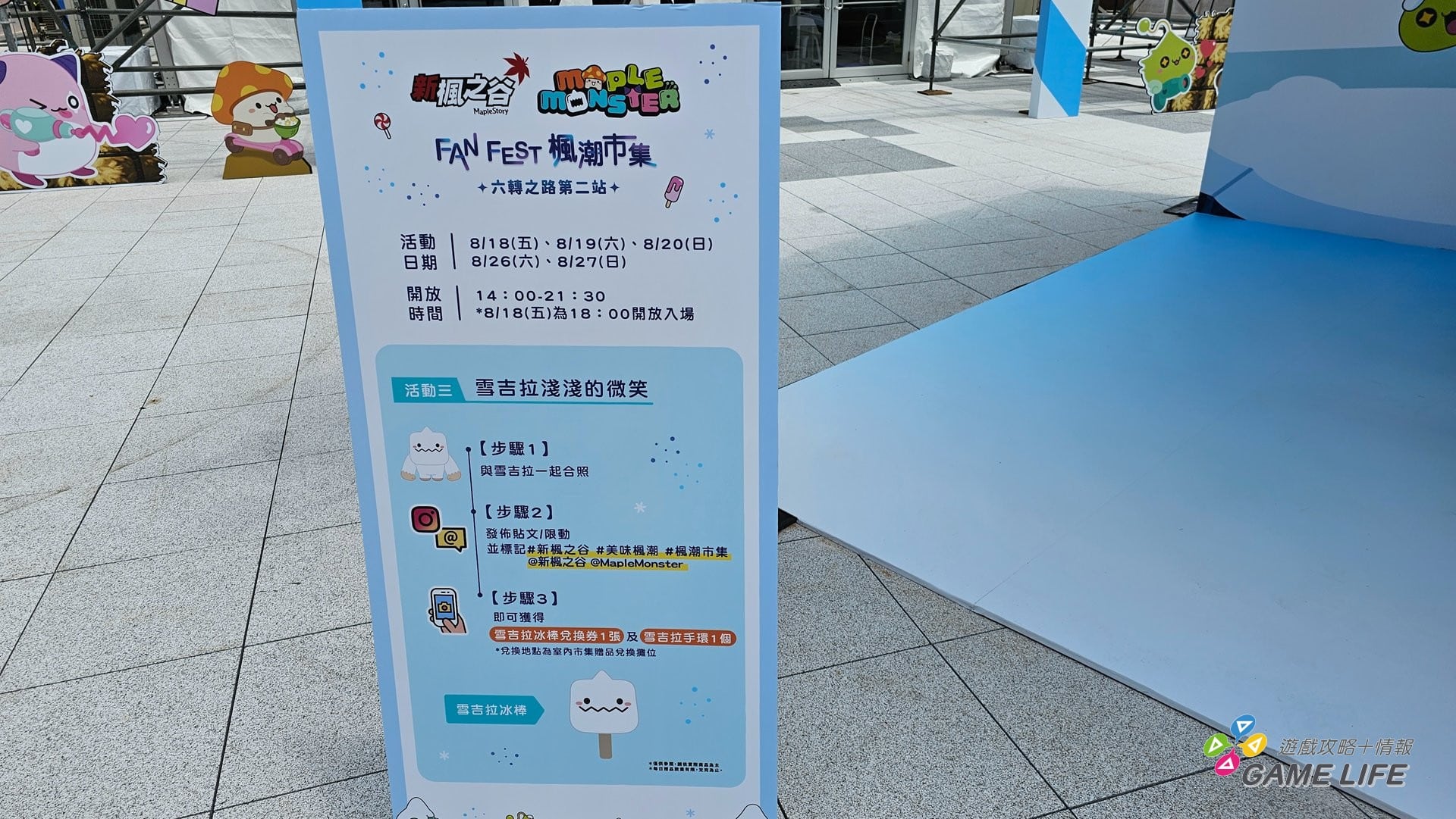 【FAN FEST 楓潮市集】從百貨的戶外步梯開始,一路充滿「MapleMonster」造景,分別有戶外及室內的美食市集,以及中央「雪吉拉」打卡造景,搭配玩家專屬任務,到 8/27 為止,完成七大任務可獲得各式限定周邊。