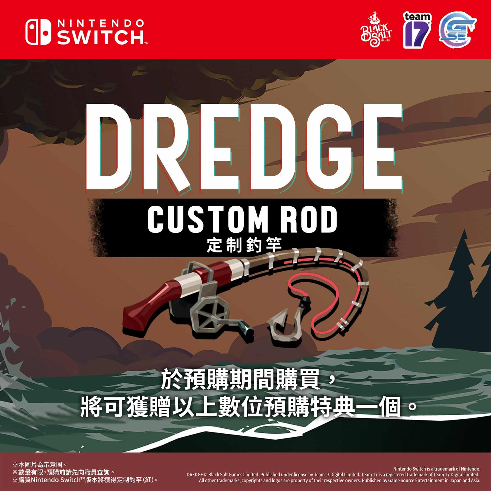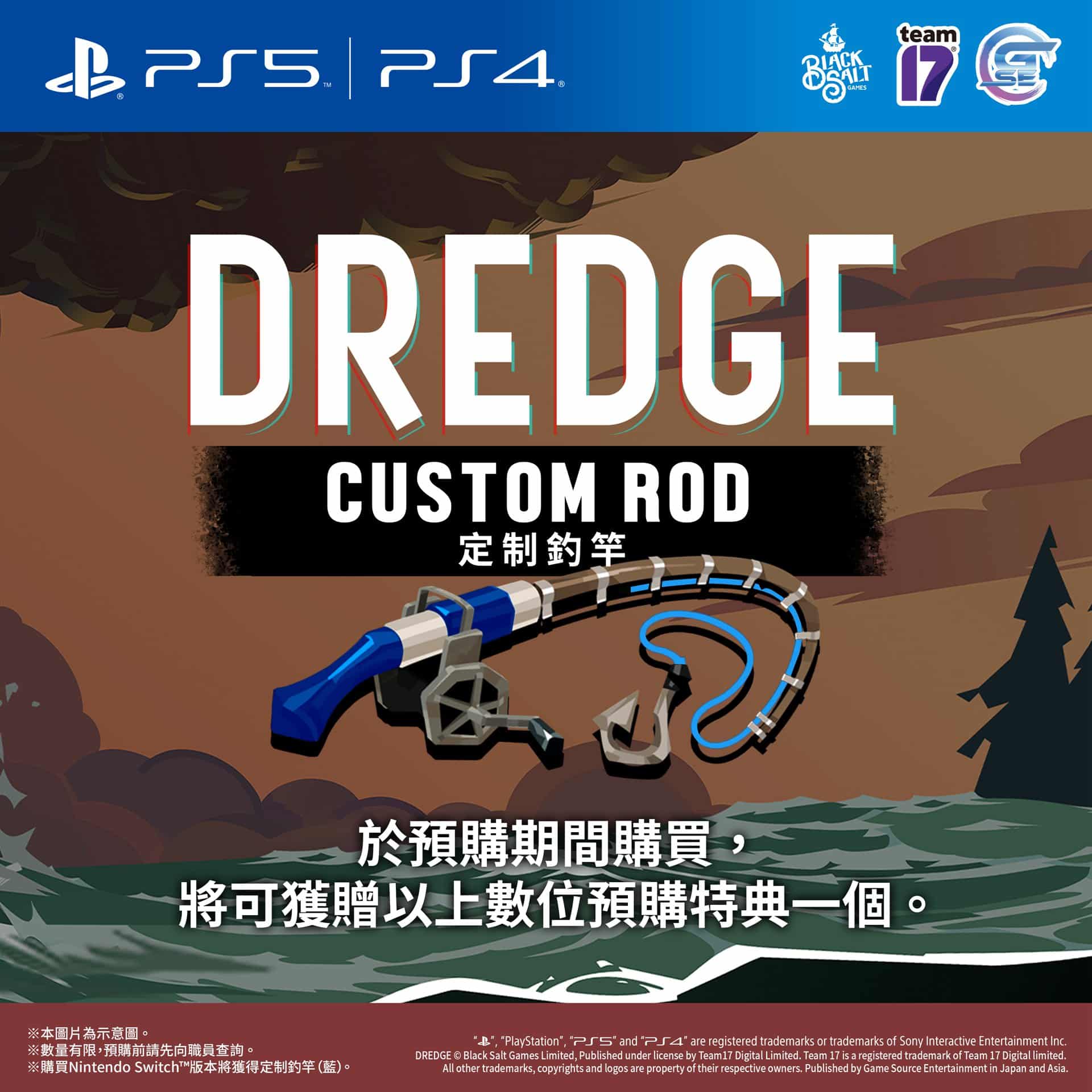 於預購期間購買《DREDGE》實體版,就可以得到數位預購特典「定制釣竿」(一個)。拿起定制釣竿,讓捕魚生涯贏在起跑線。定制釣竿擁有時尚外型,顏色視所選擇的遊戲平台而定,PlayStation 4、PlayStation 5 版本為藍色、Nintendo Switch 版本為紅色。它的性能比之同尺寸的魚竿更為優勝,使玩家能夠輕鬆領先其他垂釣者。在開始新遊戲後,定制釣竿就會取代一般的起始釣竿。