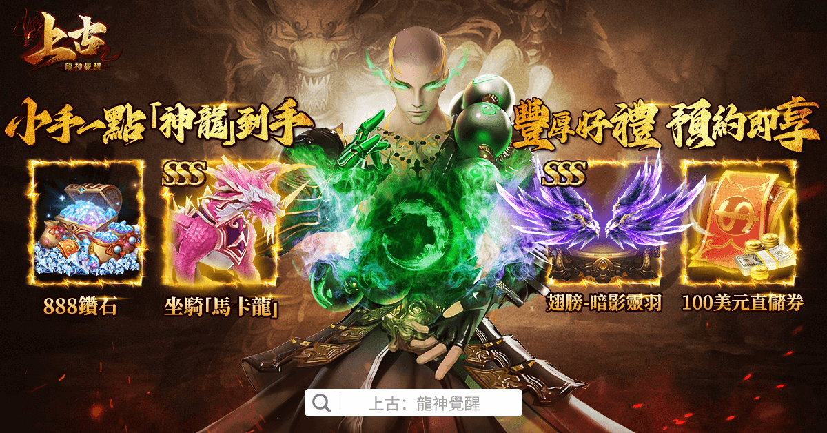 Doki Studio 宣佈,旗下代理發行的首款龍神主題,仙魔 MMO《上古:龍神覺醒》手遊事前預約活動正式開跑,即刻起預約遊戲即可領領取 888 美金直儲卡、瓜分上億直儲美金、領取龍年超限定 SSS 坐騎「馬卡龍」。