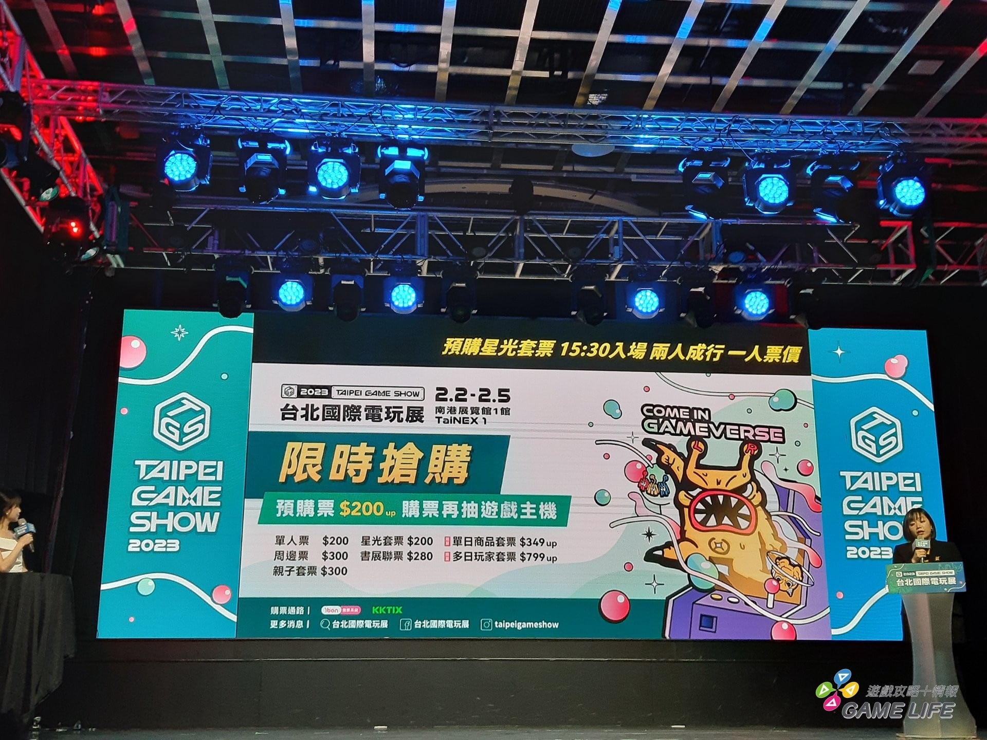 TGS 預購票現正熱賣中,玩家即日起可至 ibon、KKTIX 預購,原價 250 元、早鳥價只要 200 元,今年也首度推出星光套票,預購者可享每日 15:30 後雙人同行、一人票價的優惠,TGS 更與台北國際書展合作推出雙展套票,只要 280 元就可兩場大展一次逛到飽,還有親子套票、可加購八五折台灣高鐵車票的頂級玩家套票方案等多元方案。