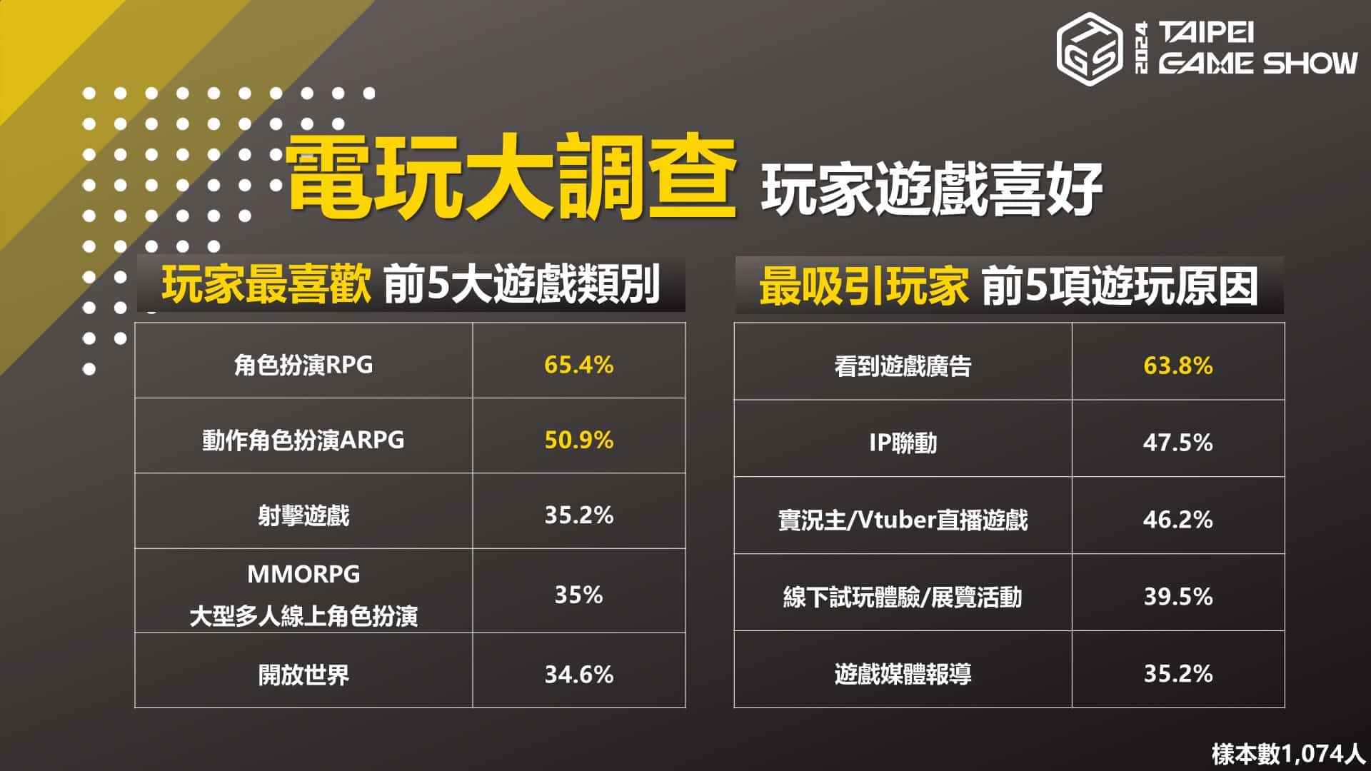 為深入了解玩家對 TGS 的期待,主辦單位特地在 10 月進行了問卷調查,共有 1074 名玩家熱情參與,其中對於慣用的遊戲平台,仍以近年來熱門的行動遊戲掛帥佔據 39%,而 PC 平台市占率也急起直追,在此次調查中共有 27% 玩家愛用,而主機及掌上型主機則是平分秋色,各占 17%,同時顯見整體主機遊戲市場仍不容小覷;問卷中也呈現了,玩家最易受吸引入手新遊戲的理由,除了廣告行銷外,動漫、遊戲或各種 IP 跨界聯動,也是令人心動的重大因素。