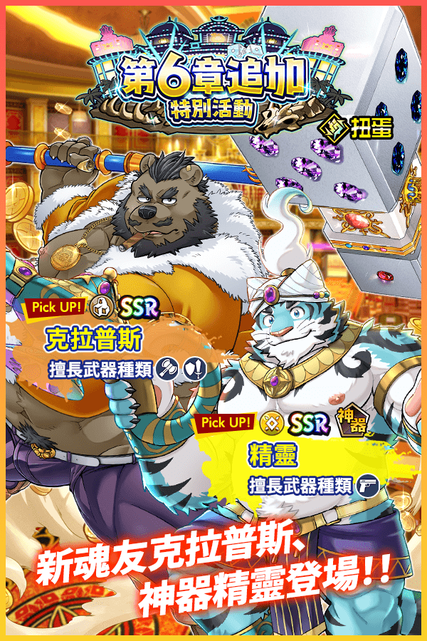 現正在舉辦的「雨停吧!晴天的寶藏獵人」活動,完成活動關卡即可獲得活動限定角色「SR 安德烈」。除此之外,收集活動掉落道具還能兌換成各式各樣的活動獎勵,讓自己的隊伍更加強大。同時開放了限定轉蛋,全新角色 SSR 魂友「特索羅」、SSR 神器「拉」都會在限定轉蛋中出現。