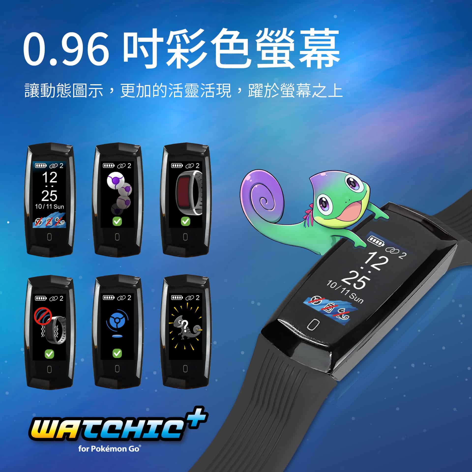 與以往的自動抓寶手環產品不同,「Watchic Plus」搭載著 0.96 吋彩色螢幕,讓動態圖示更加活靈活現。錶面除了顯示時間、連線狀況外,還加入寶可夢滿、道具背包滿等訊息圖示,讓訓練家能即時了解遊戲狀況。