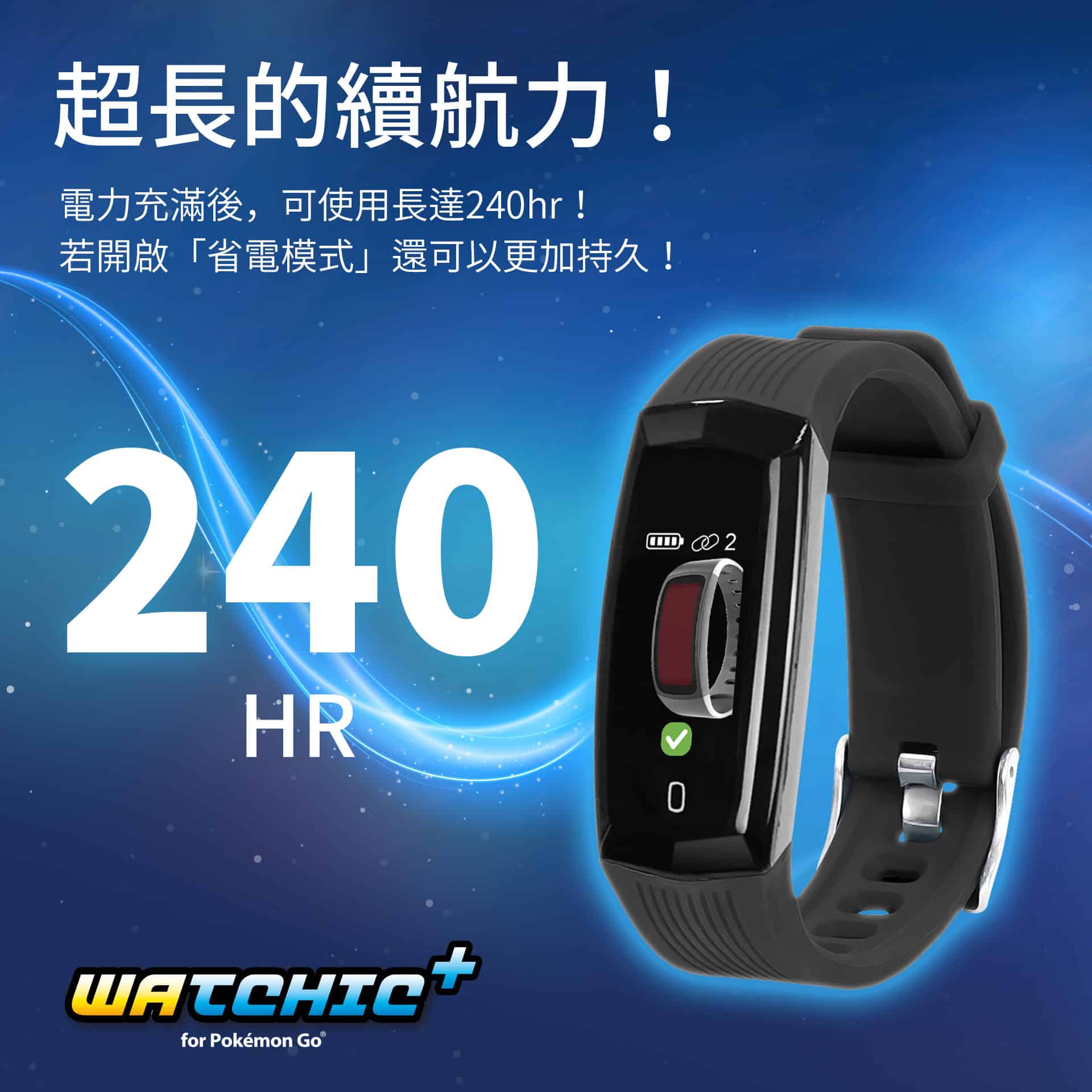 「Watchic Plus」在正常遊玩的情況下,電池續航力高達 240 小時,若開啟省電模式,還能更加持久。而為了避免訓練家忘記帶充電線的情況發生,「Watchic Plus」在錶帶中,加入 USB 充電接頭設計,只要拔掉錶帶,即可充電。再加上 IPX7 生活防水、斷線震動提醒等功能,讓玩家們可隨時隨地的享受自動抓寶的體驗。