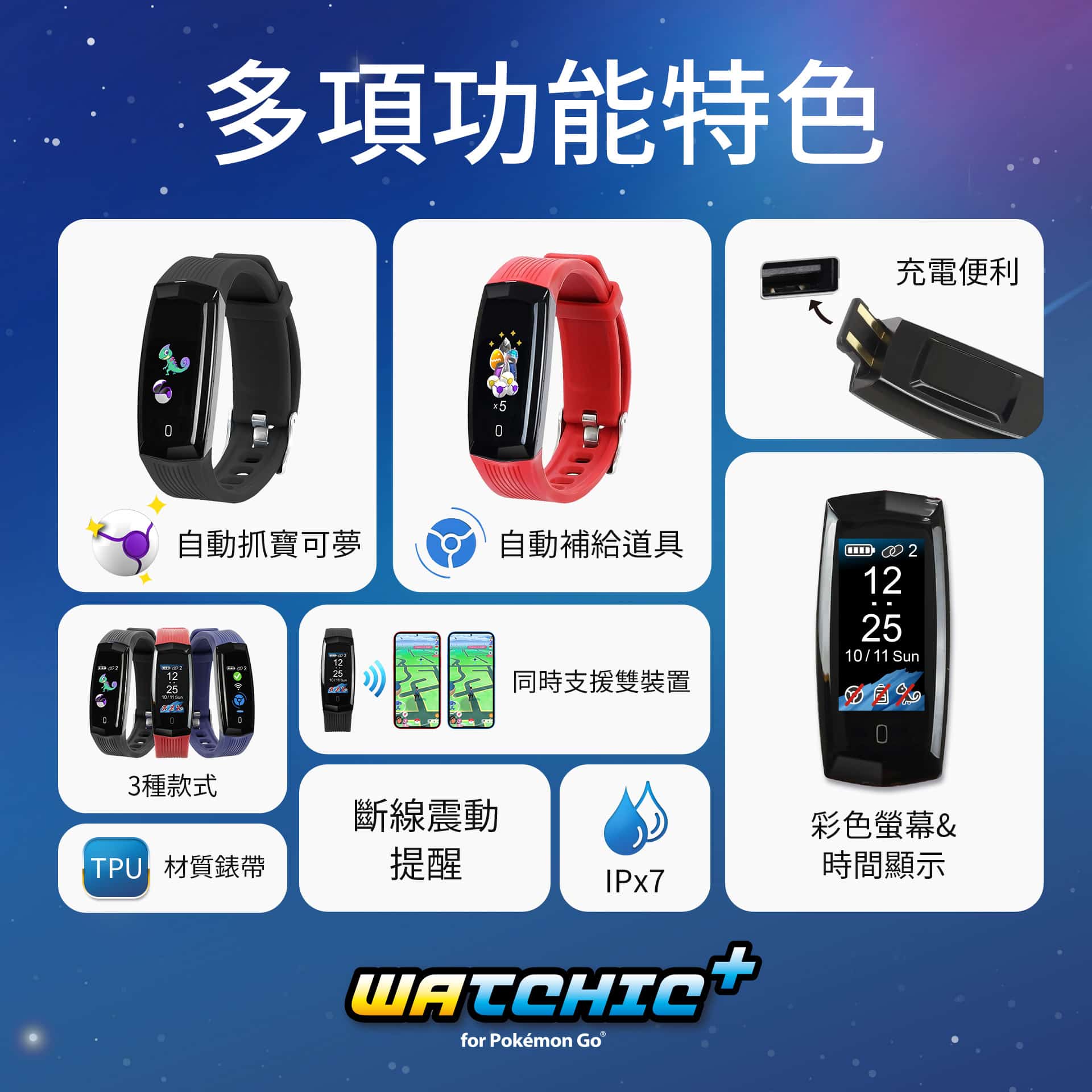 Pocket 系列自動抓寶手環是專門設計給《Pokémon GO》遊戲的周邊產品,為玩家們帶來最高效率、最穩定的自動抓寶及自動補給體驗,從邊走邊滑手機的窘境中解放,更加安全、便利地享受遊戲。而全新的「Watchic Plus」是此系列中最高階的款式,可支援雙裝置連接,一人擁有兩人使用,訓練家能與好友一同享受自動抓寶、補給的便利,增添兩人同遊的樂趣。