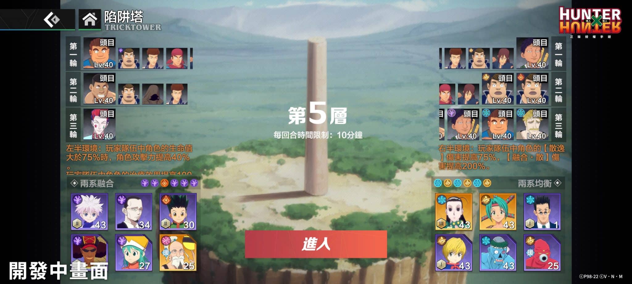 鬥智鬥勇的陷阱塔中完整還原 IP 裡與囚犯們爾虞我詐的對決,玩家必須在充滿詭譎佈陣的副本裡利用智謀與勇氣闖出一條生路,挑戰在有限時間內靈活利用策略快速過關。另外還有組隊挑戰世界 BOSS,靠著公會專屬任務獎勵及限定模式 BUFF 加成,在團戰中大展身手。遊戲中的大魔王會依據動畫原作獵人試驗,例如「失美樂濕地」所出現的魔獸耍賤草莓龜等等。