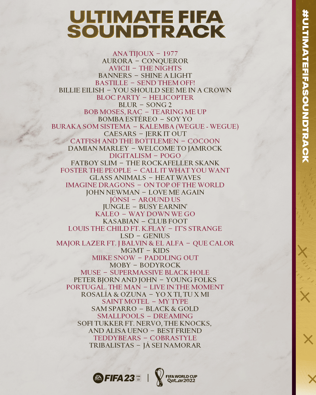 從 11 月 2 日開始,EA SPORTS 向橫跨各世代的《FIFA》玩家徵集自己最喜歡的歌曲。EA SPORTS 與 Spotify 合作,讓 1000 多首《FIFA》原聲帶歌曲能集中播放。截至 11 月 7 日為止,最受歡迎的前 100 首歌曲就會被選入這個最終播放清單。以下從百大金曲脫穎而出的 40 首經典將會在 2022 年 11 月 9 日,伴隨 FIFA World Cup 更新加入成為遊戲內配樂。