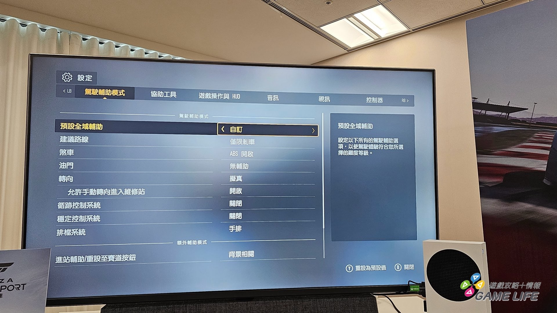 就這些訊息來看,會覺得本作相當地講求逼真,操作也可能變得更加複雜,非常不適合新手入門。但其實本作有安排完全不懂開車的玩家、有色盲障礙等的玩家遊玩的輔助功能,未經驗過賽車遊戲的玩家,可以把所有輔助功能全部打開,那麼玩家也不需要管換檔或煞車,只要會踩油門跟轉彎,就能享受這款遊戲。