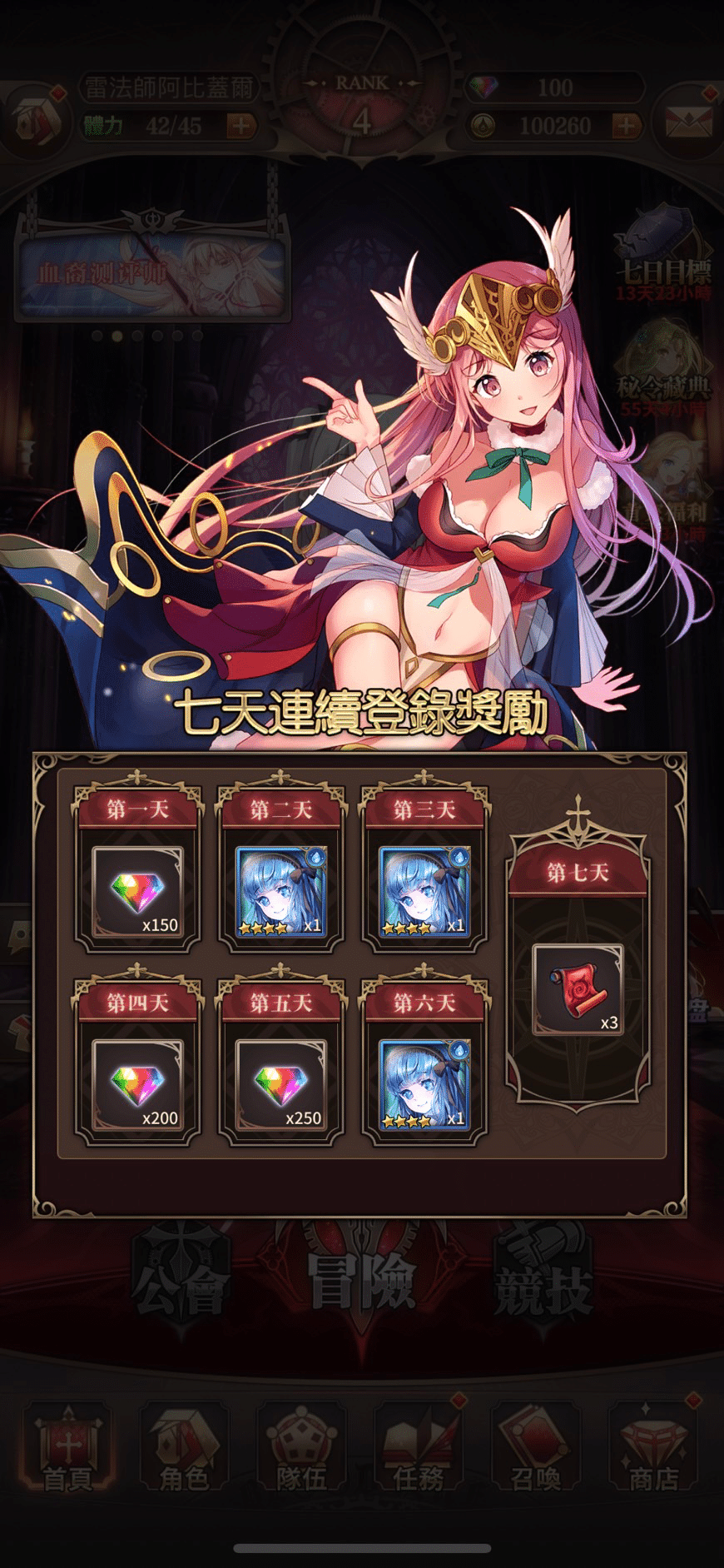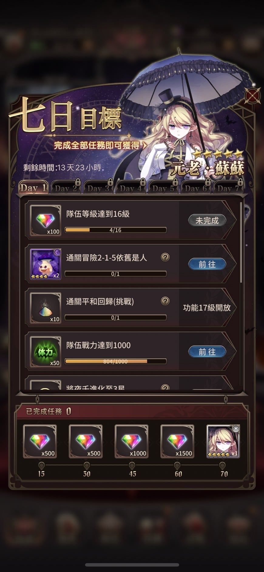 為慶祝正式上線,《LINE 血之聖約》推出了一系列登入獎勵與七日目標任務挑戰,完成即可帶走虛寶以及五星卡牌。玩家們只要連續登入遊戲七天,天天都能獲得登入禮,最高 600 顆鑽石直接入袋。除此之外,在玩家創建角色後,「七日目標」活動將自動開啟。每天將會解鎖一定數量的任務,累積完成的任務越多,可獲得對應次數的獎勵;完成全部任務即可獲得 5 星卡牌角色「元老・蘇蘇」,「七日目標」活動入口將於任務全數完成或開啟後 14 天關閉。