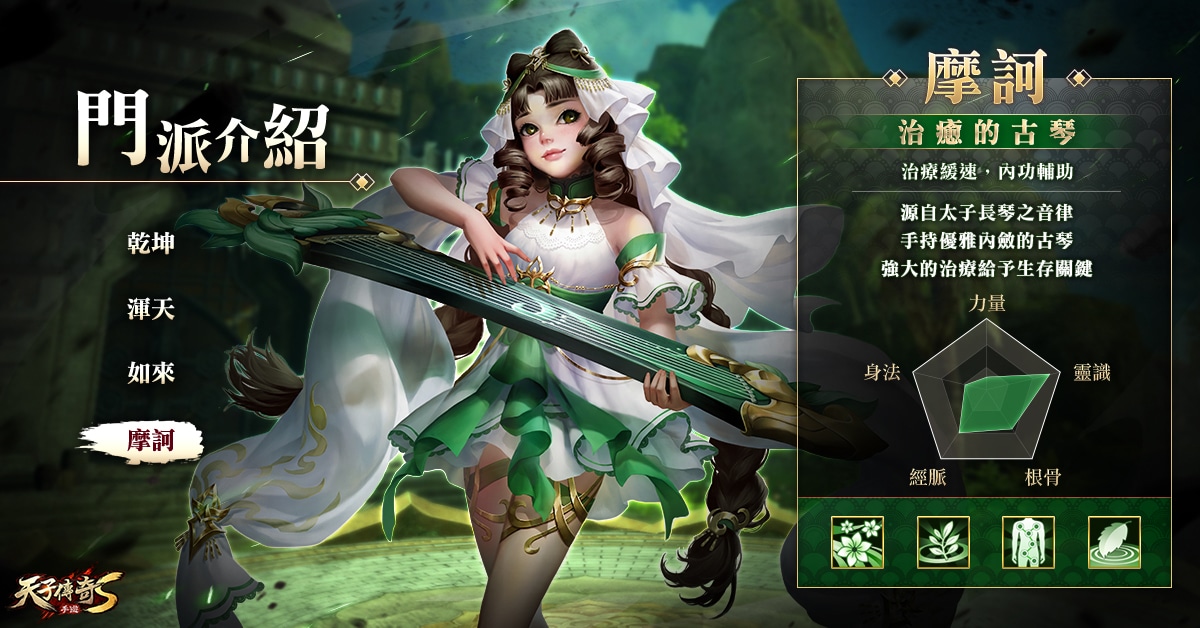 有別於一般仙俠 MMORPG 的職業門派玩法,玩家在進入《天子傳奇 S》初始創建角色時,需要先選擇掌控能力主要方向的「門派」以及做為本命星化身的「星宿」。遊戲中依據港漫《天子傳奇》故事延伸而出共有四大門派:血高防厚的堅強堡壘「乾坤」、舞動神劍專精內功輸出的「渾天」、擁有高暴擊外功傷害的戰場刺客「如來」,以及彈奏音律善於輔助恢復的「摩訶」。玩家可憑藉個人喜好選擇最合適的門派展開修練。