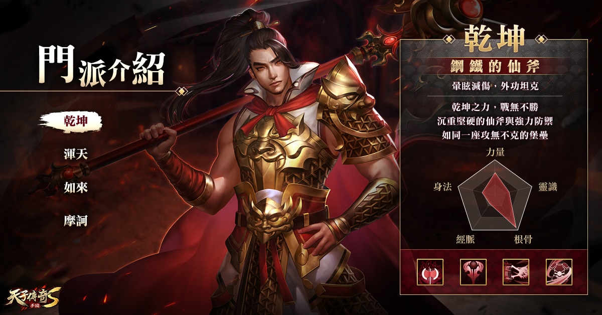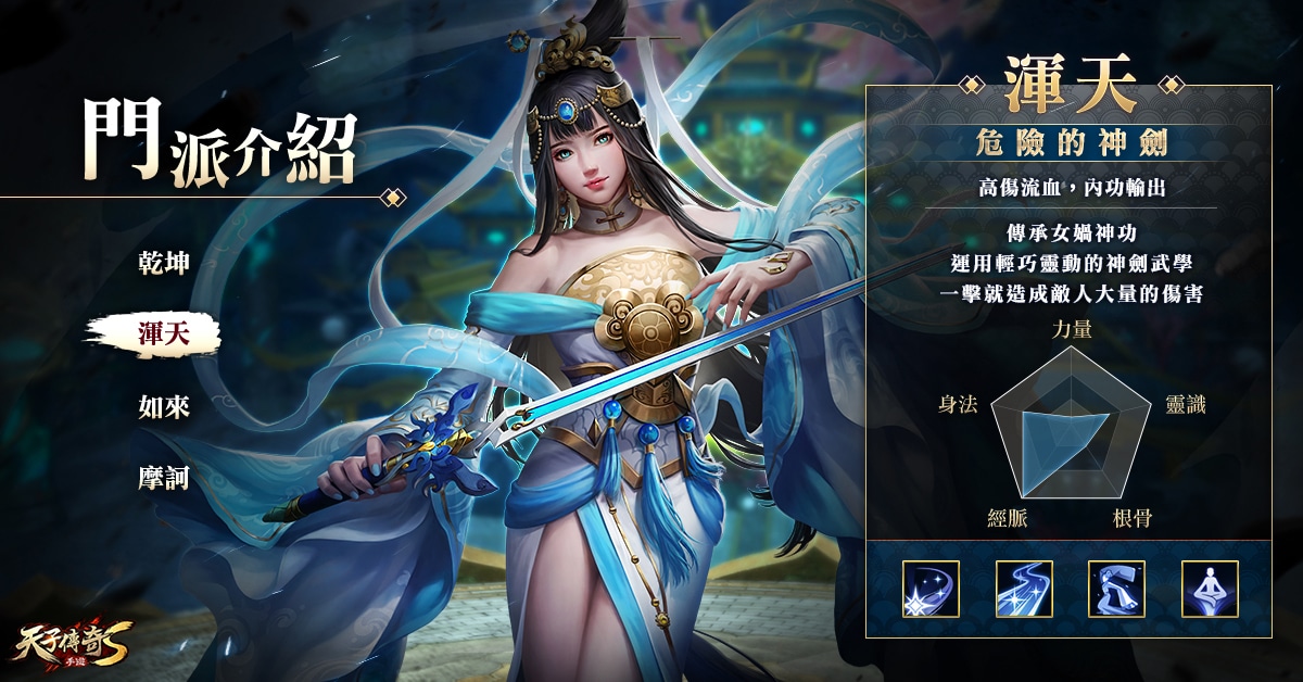 有別於一般仙俠 MMORPG 的職業門派玩法,玩家在進入《天子傳奇 S》初始創建角色時,需要先選擇掌控能力主要方向的「門派」以及做為本命星化身的「星宿」。遊戲中依據港漫《天子傳奇》故事延伸而出共有四大門派:血高防厚的堅強堡壘「乾坤」、舞動神劍專精內功輸出的「渾天」、擁有高暴擊外功傷害的戰場刺客「如來」,以及彈奏音律善於輔助恢復的「摩訶」。玩家可憑藉個人喜好選擇最合適的門派展開修練。