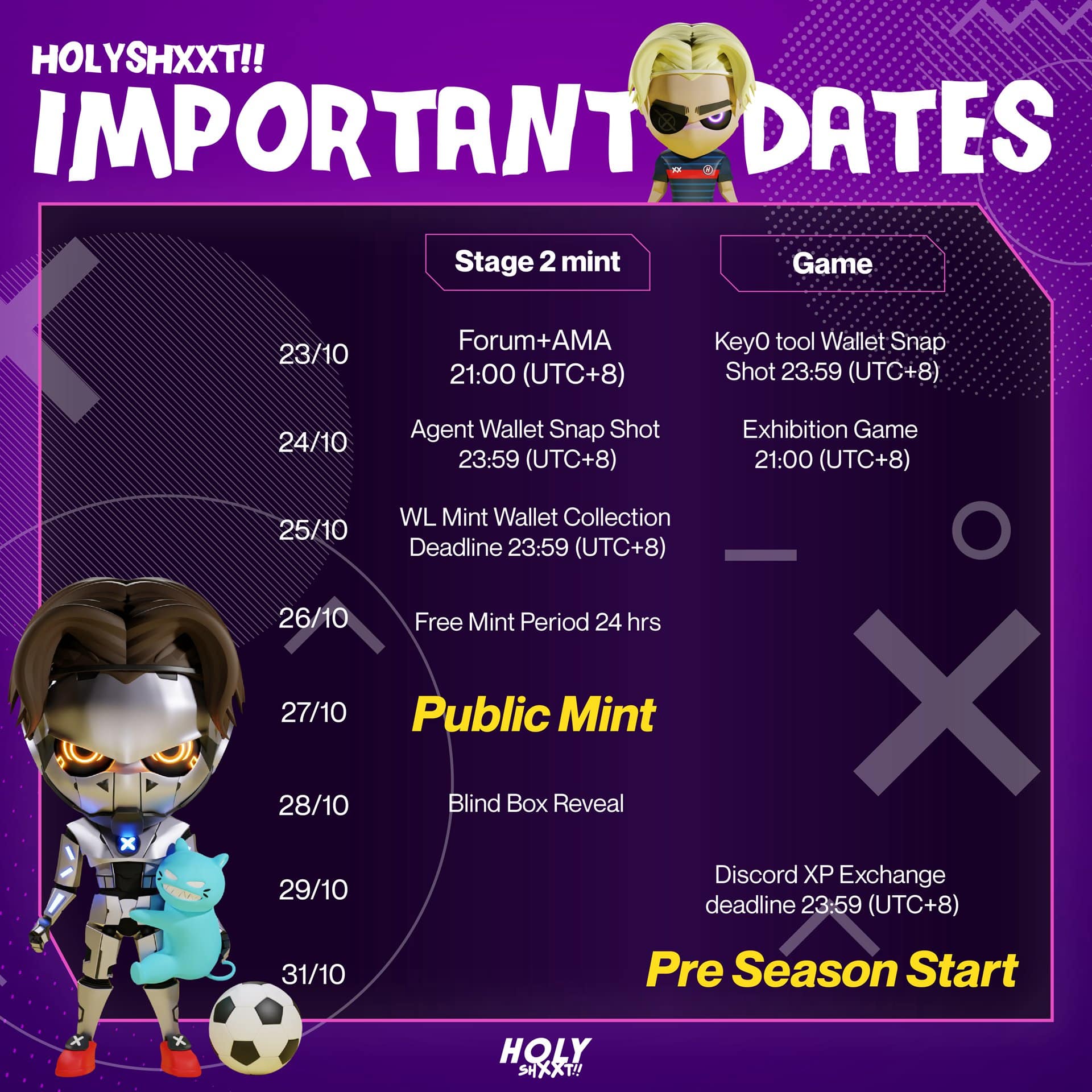 務求給更多球迷享受區塊鏈足球策略遊戲的樂趣,並為即將開展的球賽招兵買馬,《NFT HolyShxxt!!》10 月 27 日將再次發售球員 NFT,每隻原價 0.13 ETH;現時NFT持有者特享優惠折扣,可用 0.05 ETH 購買,準備好加入戰場的 Elite 會員及 White List 持有者也獲優惠價 0.1 ETH。團隊亦籌備在 2023 年向每位球員經理人加送 2D 版的球員 NFT。