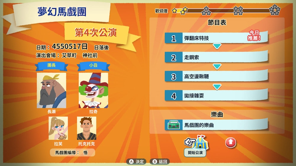 主角身為馬戲團團長的兒子,隨著故事劇情進展將有機會規劃馬戲團公演的節目內容,自由決定表演項目與搭配的樂曲等。進行越多場馬戲團公演就能進一步提升馬戲團的等級,升級後就能在單場公演中安排更多節目,同時還能增加新的表演項目並獲得新的樂曲與服裝。