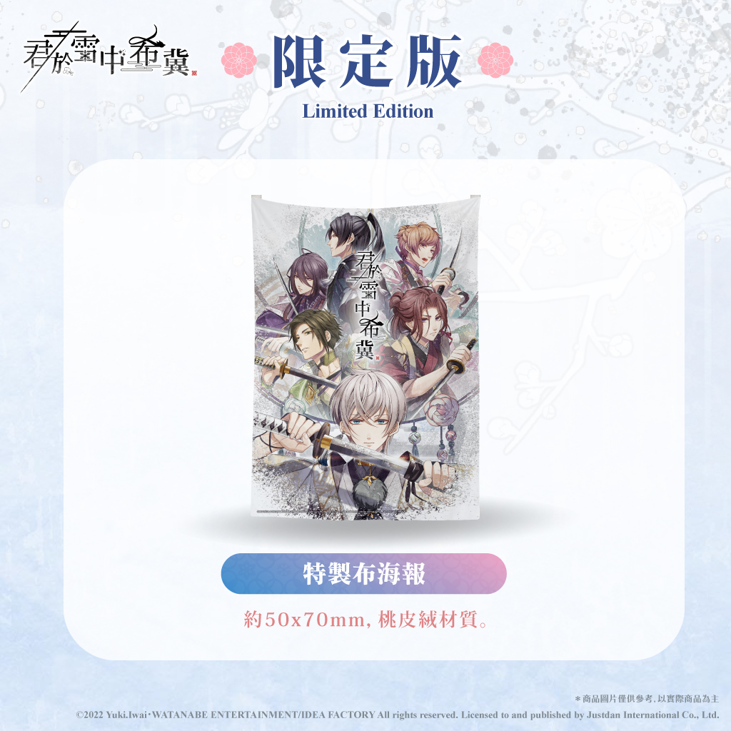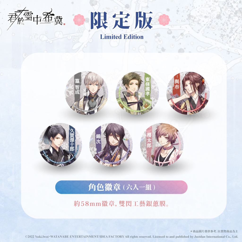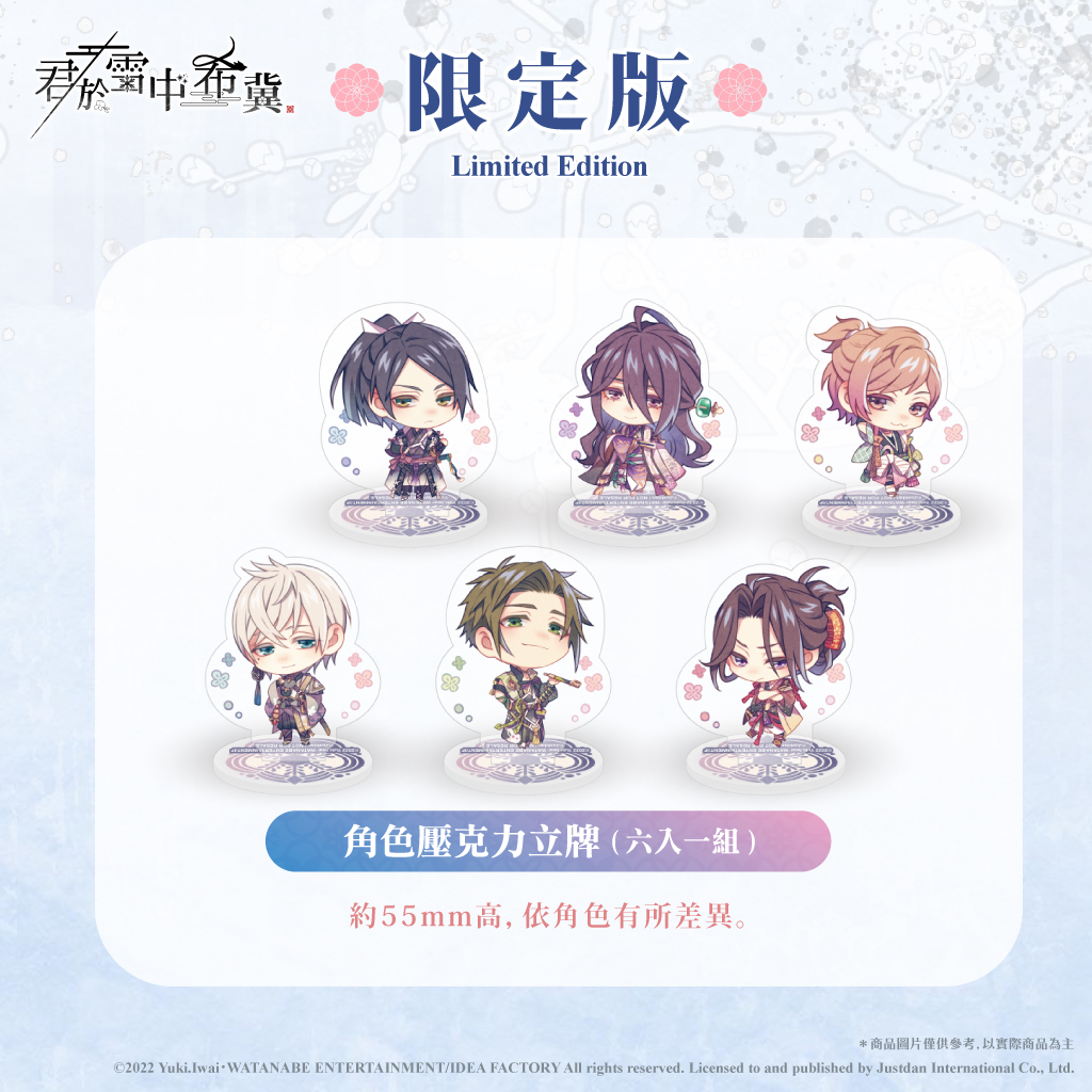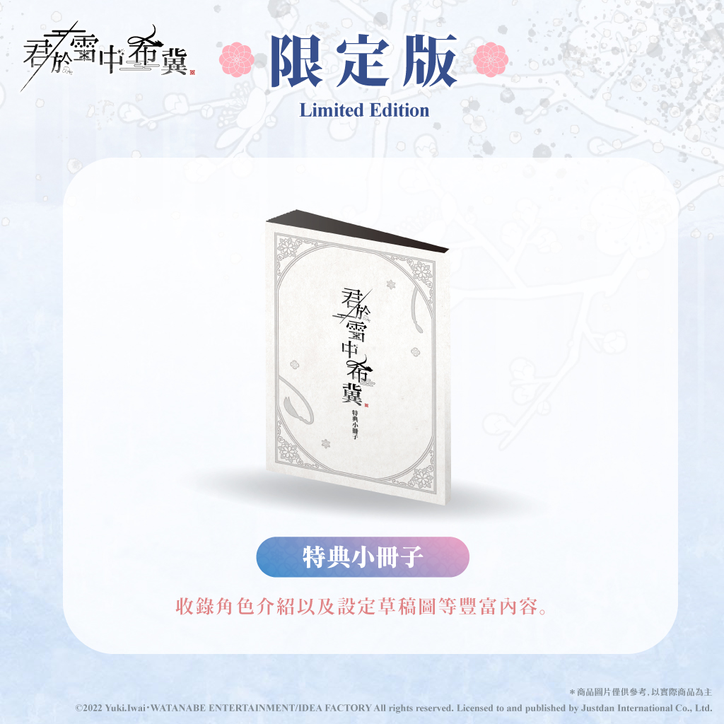 本次《君於雪中希冀》也將推出獨家豪華升級的亞洲中文限定版,收錄各式各樣珍藏周邊。除了原日本限定版內附的完全中文化特典小冊子外,本次採用 USB 收錄原聲音樂以及廣播劇,同時也將附贈中文台詞本,讓玩家更容易了解其中劇情。另外本次針對亞洲玩家,也特別製作布海報、角色徽章以及角色壓克力立牌。