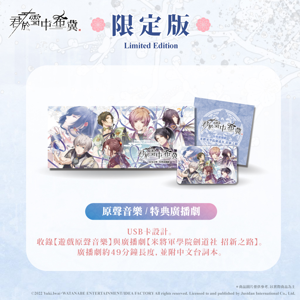 本次《君於雪中希冀》也將推出獨家豪華升級的亞洲中文限定版,收錄各式各樣珍藏周邊。除了原日本限定版內附的完全中文化特典小冊子外,本次採用 USB 收錄原聲音樂以及廣播劇,同時也將附贈中文台詞本,讓玩家更容易了解其中劇情。另外本次針對亞洲玩家,也特別製作布海報、角色徽章以及角色壓克力立牌。