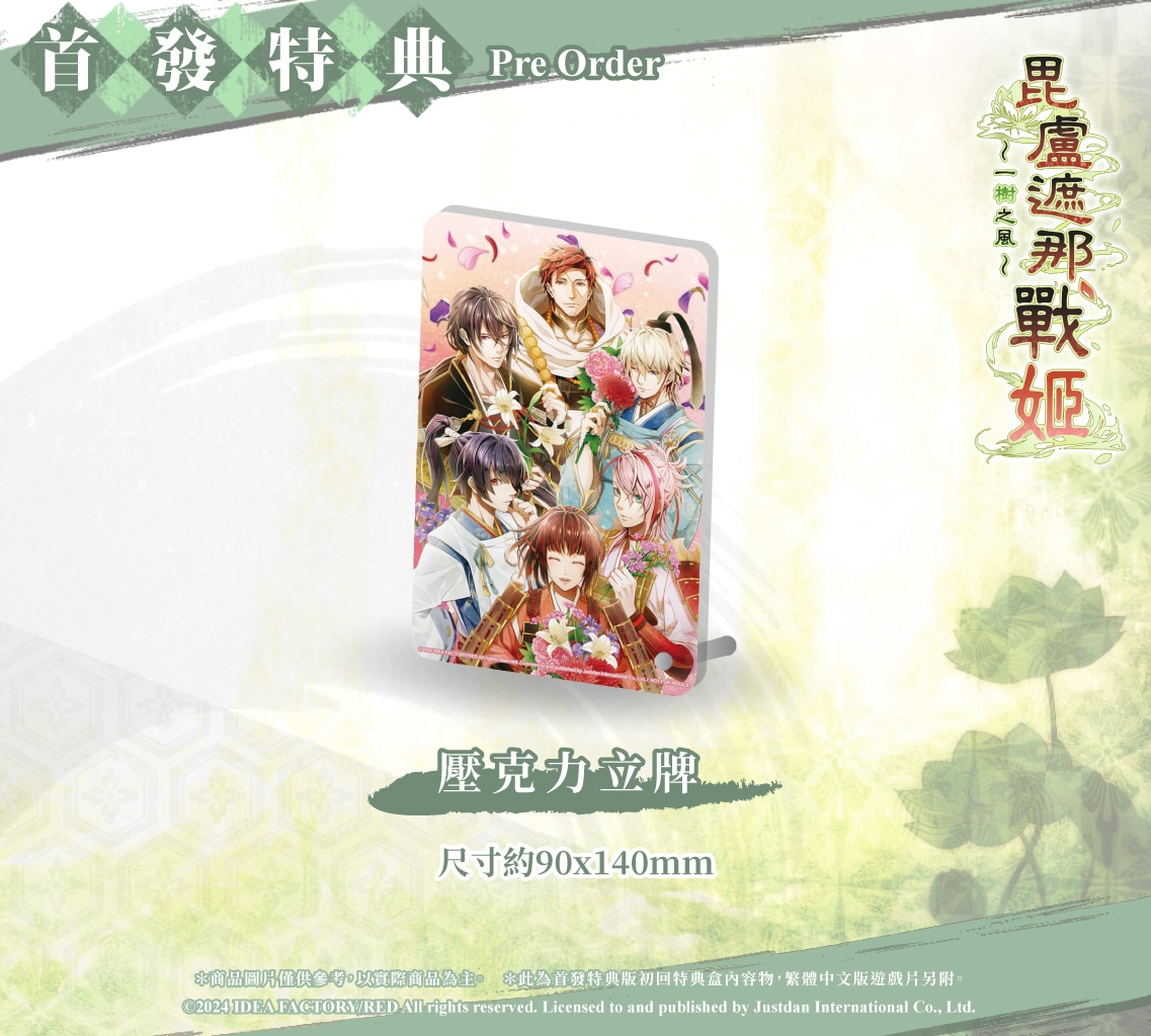 首批《毘盧遮那戰姬 一樹之風》中文實體版將免費升級為「首發特典版」,讓喜愛《毘盧遮那戰姬》系列的玩家可以一次擁有眾多特典。本次「首發特典版」包含日本限定版才有的小冊子,內含主視覺圖、角色設定介紹,以及原創短篇小說等豐富內容,並且將完全中文化。同時也獨家製作五款嚴選視覺圖明信片,另外還特製了無論擺設何處,都能回味與每位男性角色歡樂點滴的壓克力立牌。