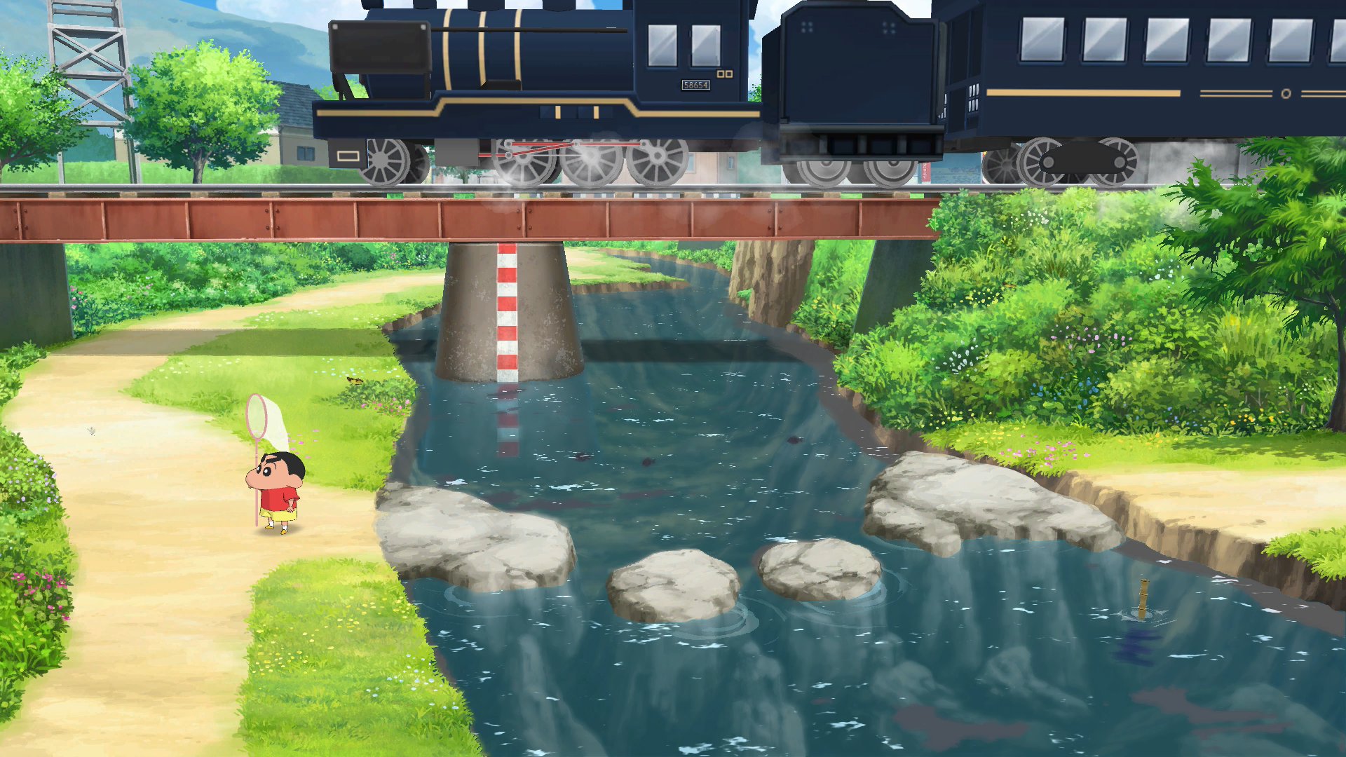在被大自然包圍的阿素鎮中,蟬鳴聲的山間小路、川流不息的小河、佇立於鄉間的設施甚至是孩子們打造的秘密基地等等,皆是小新可以前往冒險的區域。進行早操以及與火山一家吃完早餐以後,就可以開始每日的行程。玩家可以成為小新在阿素鎮展開冒險。無論是前往林間捕捉珍稀的昆蟲,或是在河流溪畔旁釣魚,都可以自由自在地享受日本夏季鄉村生活的時光。