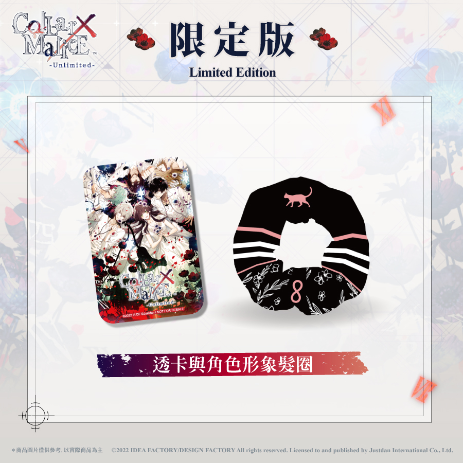 本次《Collar × Malice Unlimited》亞洲中文限定版,將以最豪華且粉絲最為期待的內容物進行收錄。除了眾多粉絲引頸期盼的完全中文化特典小冊子「Tragic love story」外,還有廣播劇、角色書籤、壓克力立牌以及形象珍藏透卡等等。同時本次還特別製作以女主角形象作為設計的特製髮圈,讓玩家可以搭配穿搭來進行使用。