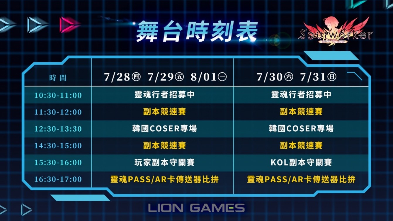除了邀請實況主月希、小饅頭與玩家進行副本守關賽外,還有遠從韓國特邀來台的 COSER 也將出席。現場還將規劃獨家試玩、闖關活動,完成活動集章即可獲得展場限定專屬好禮,並可參加摸彩抽獎活動,有機會將電競光學滑鼠、RGB 機械式鍵盤、電競筆電等大獎帶回家,邀請新舊玩家一同參與《靈魂行者》夏日盛會,迎接第二季全新篇章。