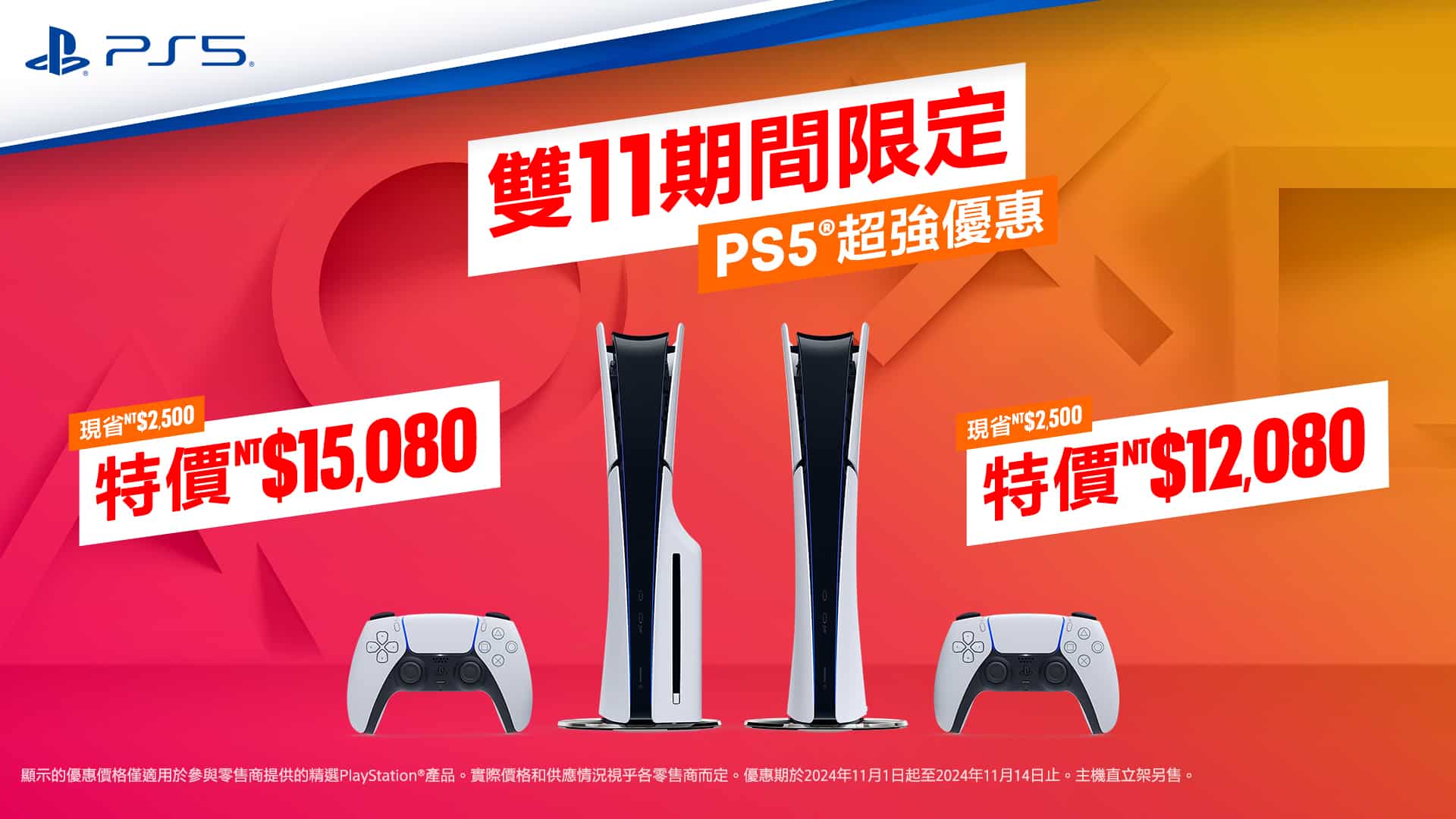 PlayStation 正式宣佈,「雙 11 期間」限定折扣優惠將於 2024 年 11 月 1 日至 14 日盛大登場,於授權經銷商戶購買 PlayStation 5 主機、周邊設備及遊戲皆可享有眾多折扣優惠。