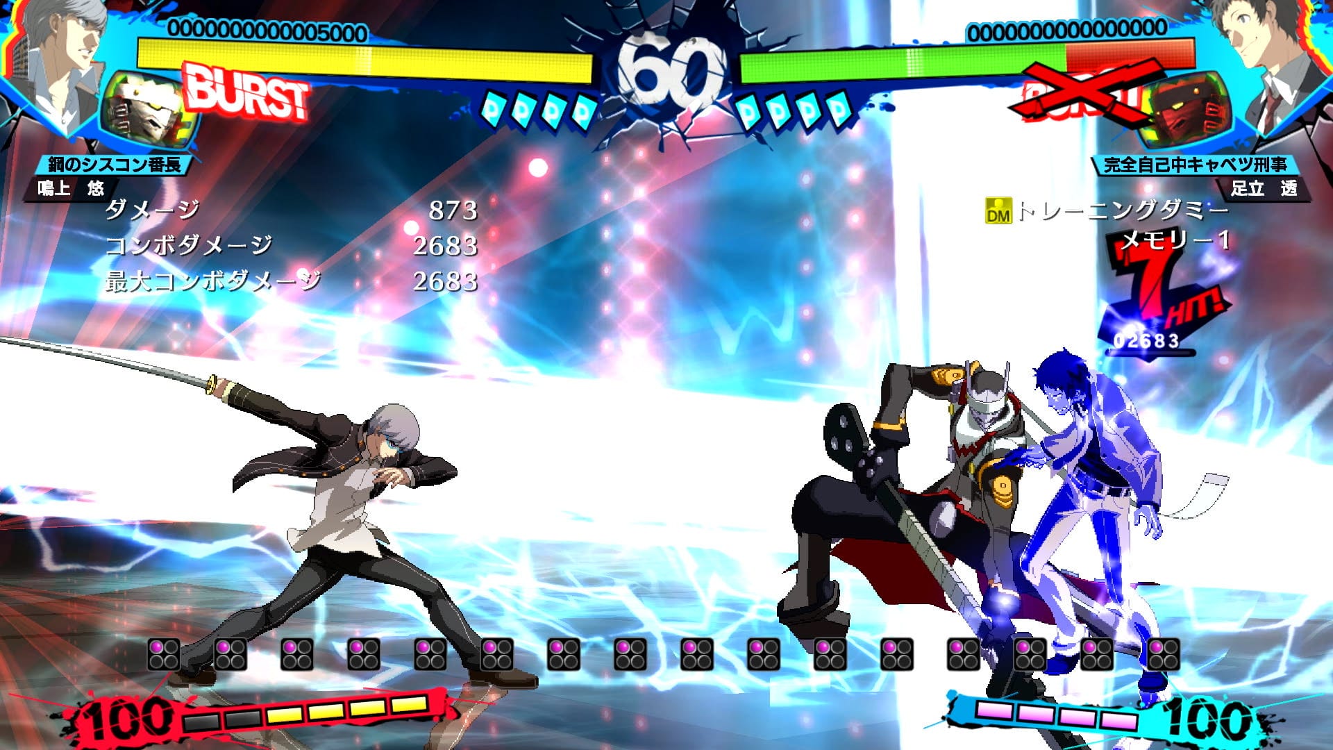 2D 對戰格鬥部分由擅長打造對戰格鬥遊戲的 ARC SYSTEM WORKS 操刀。除了可施展角色與人格面具相互搭配的連段攻擊外,還有格鬥遊戲罕見的負面狀態等元素,即使是格鬥遊戲玩家也能盡情鑽研遊玩。此外,遊戲也內建了多種系統,讓身為格鬥遊戲新手的女神異聞錄粉絲也能輕鬆遊玩。例如按按鍵就能使出連段、攻擊的連按連段、重現《女神異聞錄 4》世界觀的全力一擊與全力追擊等等。