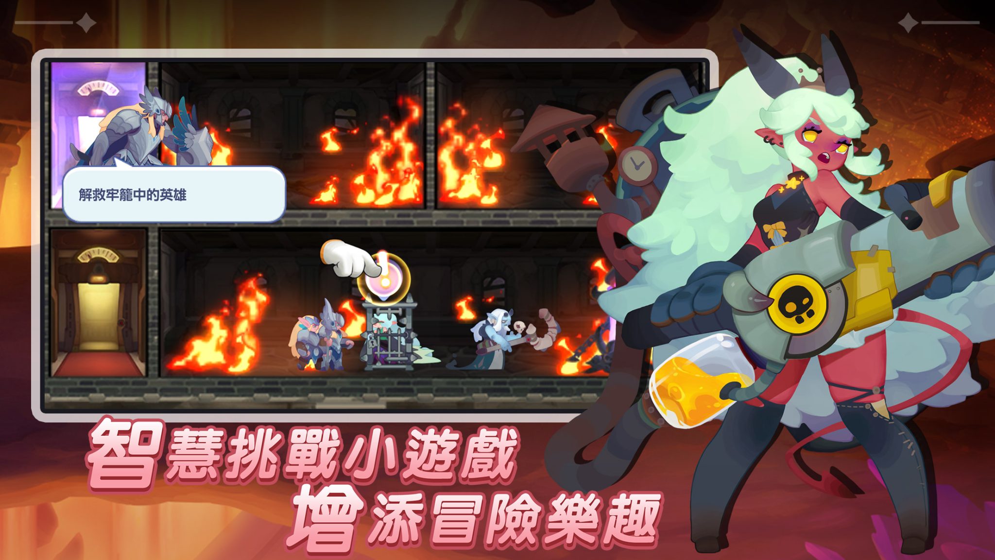 在冒險旅程當中,玩家將會逐一探索各式關卡觸發隨機事件,例如隔壁村莊燃起的救援狼煙,只要順利拯救村莊將可獲得豐厚獎勵,包含村莊的貢獻加成、掛機收益增加,還能讓一覽領地美景等等。若想稍作休息,遊戲內也設有豐富的休閒活動,如釣魚、烹飪與數學挑戰小遊戲等,這些活動不僅能幫助玩家舒緩壓力,還能獲得額外的獎勵,讓冒險之旅更加生動有趣。