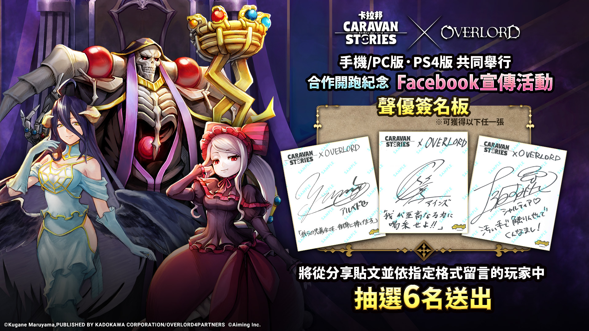 為紀念合作活動舉行,目前於官方 Facebook 舉行有機會抽中原作小說及配音聲優簽名板的貼文分享宣傳活動,只要分享指定貼文並留言指定內容即可參加。適逢 TV 動畫第 4 季確定播出,官方會抽選 1 名玩家送出原作小說 1 ~ 14 集,以及抽出共 6 名玩家送出日野聡(飾演安茲)、原由実(飾演雅兒貝德)以及上坂すみれ(飾演夏提雅)的簽名板。