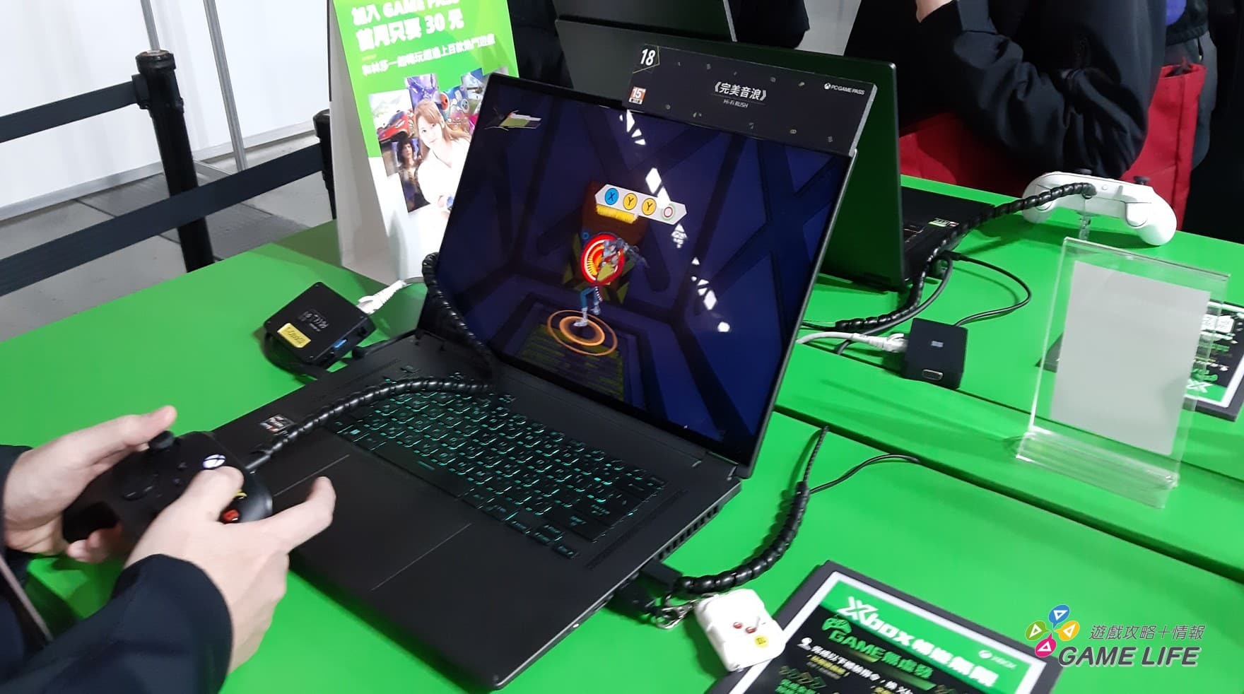另外兩個區域則分為 PC 區跟家用主機區,家用主機區掛上幾個中等大小的螢幕,展示著 Xbox 的一些主力跟發售後就登上 Xbox Game Pass 的知名作品,例如《魔物獵人 崛起》等。相較於家用主機區,PC 區就展示了較多作品,用許多筆記型電腦一一排開,讓玩家能現場體驗各種遊戲。