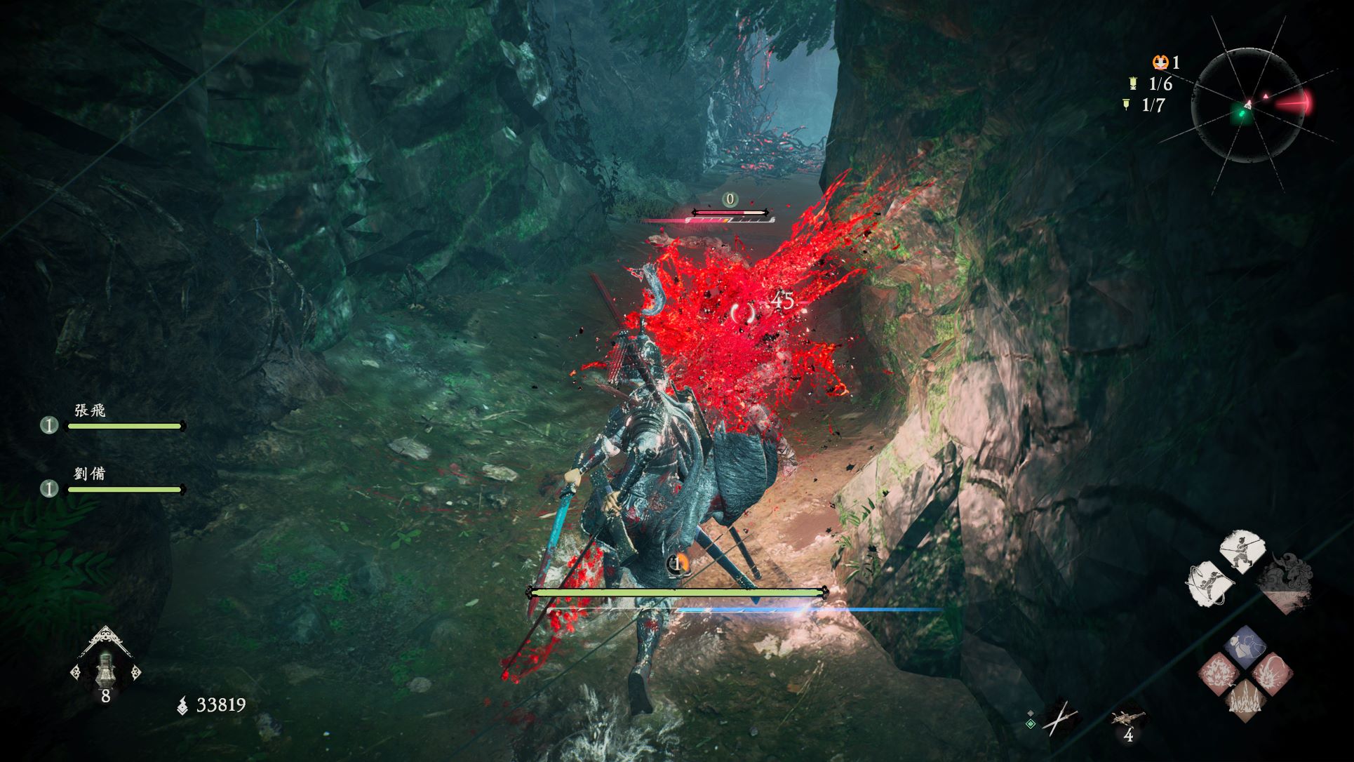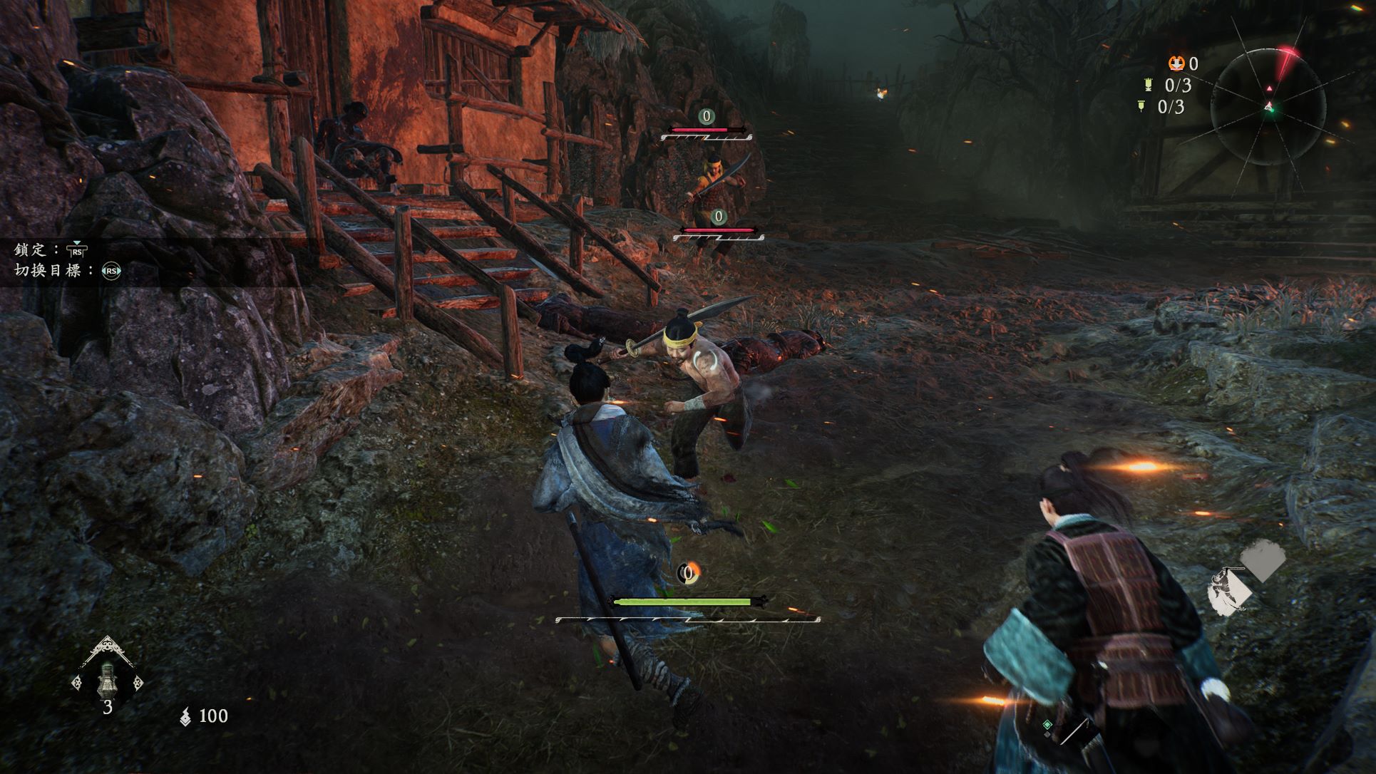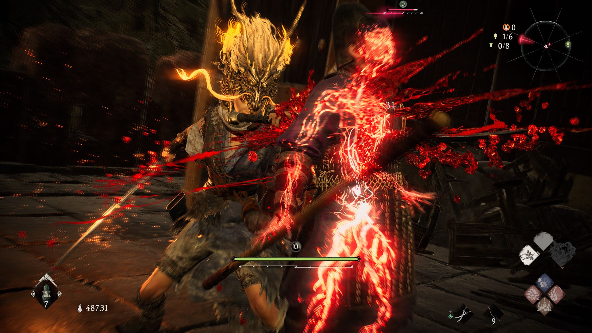 作為一款動作遊戲,《臥龍》在操作上的表現絕對是頂尖的水準。人物操作手感很絲滑,爬梯子、翻上屋頂這些動作一點也不拖泥帶水,真的有在操作武俠的感覺。Team Ninja 的戰鬥手感就是掛保證,敵人受傷的傷害反饋跟噴血特效,在畫面表現力上十分過癮。