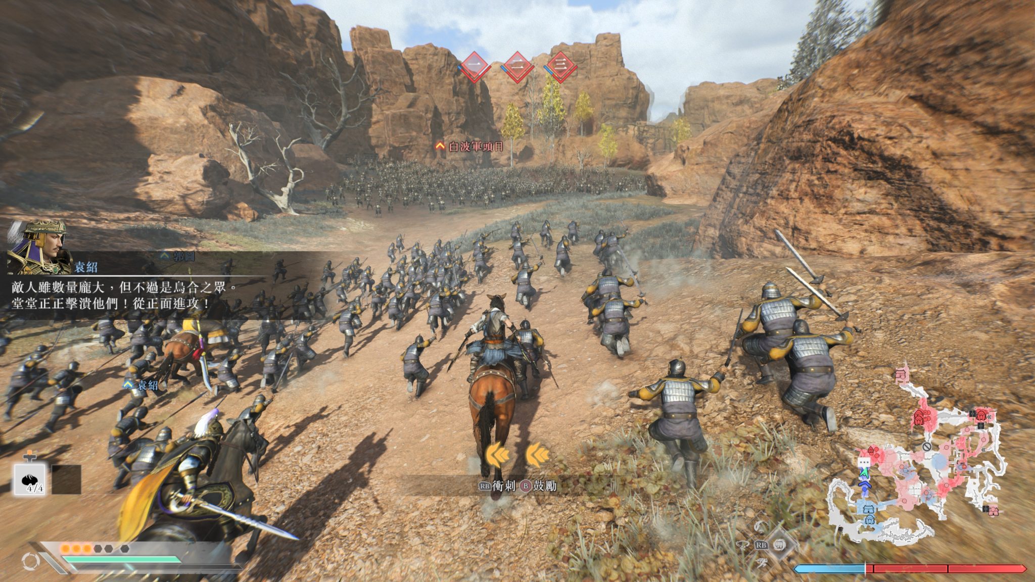 儘管這些機制在設計上提升了遊戲性,但執行效果卻存在顯著問題。首先,敵方的攻擊動作過於單調,能輕易掌握完美格擋與閃避的時機,失去了應有的挑戰性。此外,這兩項機制與《無雙》系列的一騎當千核心理念存在衝突。尤其在大規模軍團進軍的場景中,螢幕上的信息過於混亂,甚至連找到主角的位置都成為難題,更別說精準辨識敵方武將的動作進行格擋或閃避。這樣的體驗在戰鬥節奏中無疑成為了一大阻力,讓人難以完全享受戰場上的熱血與爽快感。