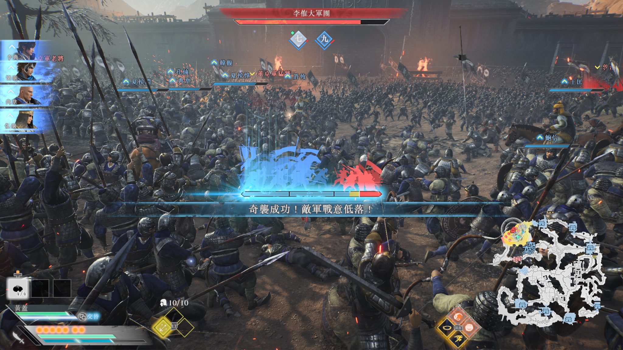 遊戲的士氣值系統成為決定勝負的核心要素。壓制敵方據點、擊敗敵方武將,都能有效降低對方的士氣值,而士氣越高,我方武將越不易敗走,敵方武將則會變得脆弱,血量更容易削減。這樣的設計讓戰場的節奏與策略性得到了進一步強化,需要在戰場上迅速決策,以壓制敵方士氣並穩住己方陣營。
