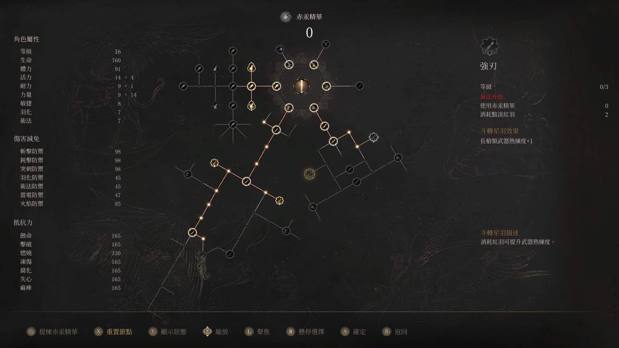 角色培養方面,《淵虛之羽》捨棄魂系自由加點路線,轉向傳統 RPG 的技能樹系統。共有六條技能樹,分別對應五種武器與主角核心能力。令人驚喜的是武器熟練度機制——只要點滿技能,所有同類型武器都會一併強化。更棒的是,技能樹可隨時洗點,且無任何懲罰,讓玩家能根據不同 Boss 或關卡自由轉換流派。這點設計不只親民,更大幅提升了遊戲的耐玩度與嘗試意願。