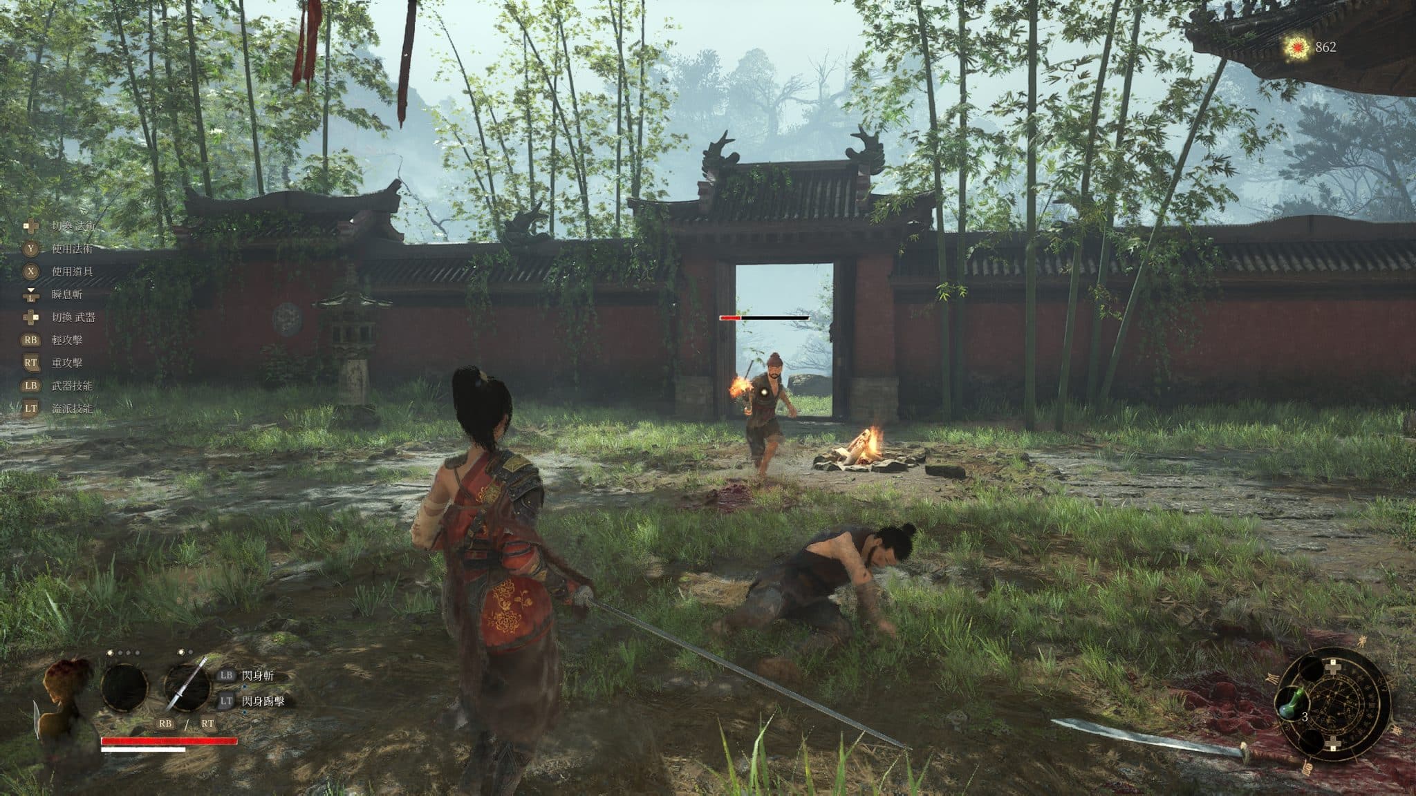 最先打動我的是場景與氛圍的美學營造。走出新手區,一整座錯落有致的中國古建築群映入眼簾:灰瓦飛簷、木構長廊、香火繚繞的寺廟與墓園,在細膩視覺風格的襯托下格外有味道。老實說,我對中國歷代建築風格並沒有深入研究,但這款遊戲卻成功地說服了我:「眼前的,就是明代末年的世界」。那種厚重、蒼涼,又略帶荒敗感的氣質,搭配敵人的服飾、兵器與場景殘骸,一切都讓人信服。