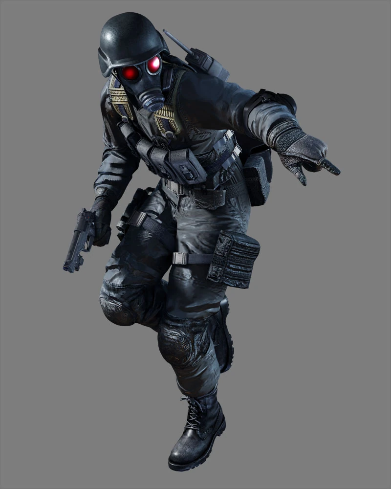 漢克的形象據說是卡普空參考了英國的 SAS,而他戴的防毒面具應該是 S10 NBC(看網友說的),也是 SAS 的招牌裝備。漢克多數時候都沒有露出真面目,但在 3 代結尾,漢克其實有脫下防毒面具,露出他的臉。雖然沒有到非常清楚,但看的出來是一名帥哥。