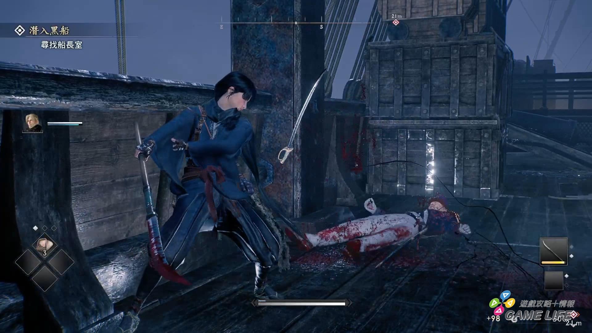 戰鬥概念就是《仁王》或《臥龍》那套有一組基本攻擊可以使用,玩家自己搭配遠近武器、跳躍、迴避等動作來運用,然後戰鬥中要留意的除了歸 0 就會戰死的體力外還有攻防動作上都會減少的耐力,我方耐力歸 0 會陷入一段時間的無力狀態讓敵人打、敵方耐力歸 0 則可以讓玩家趁機給予有特殊演出的「致命一擊」。當然扣除劇情要求的頭目外,大部分的敵人都可以靠潛行暗殺,就算無法即死也能先發制人。